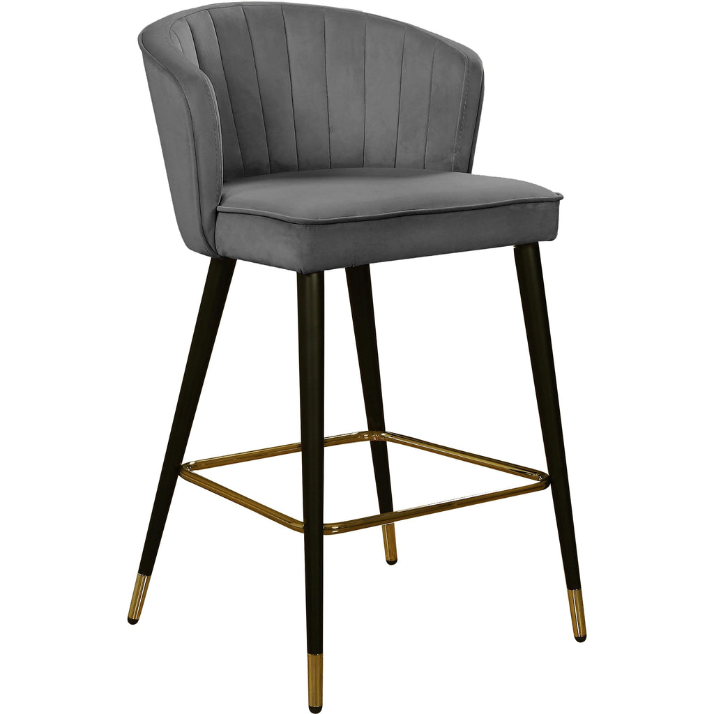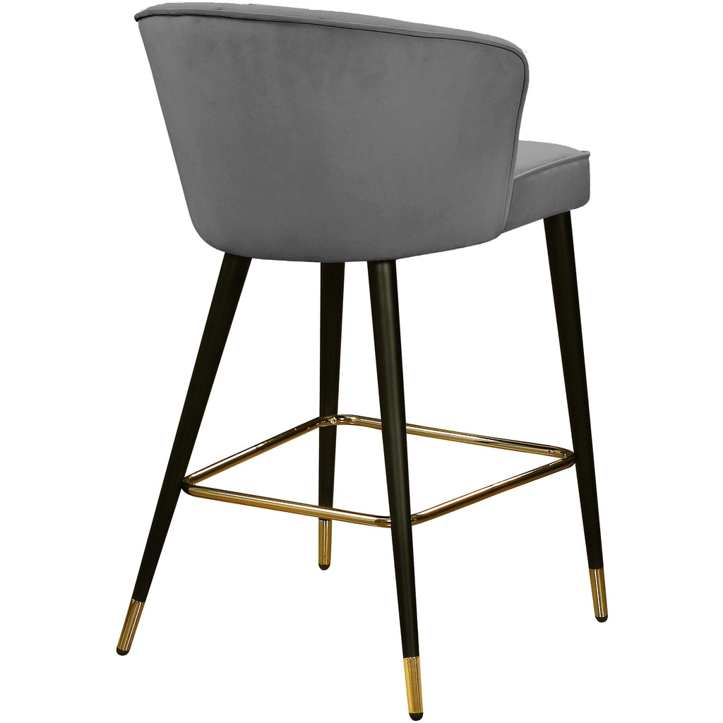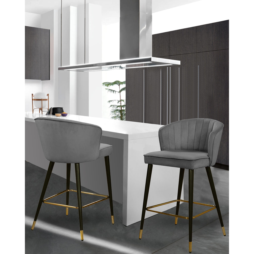 Give your kitchen counter a fresh new look with this Cassie Grey Velvet Stool. The shell-shaped back and channel tufted design draw the eye, making this stool an attention-commanding addition to your space. The sleek black metal legs flare slightly to create a modish silhouette, while goldtone tips on the ends and a goldtone foot rail complete the look. Rich velvet in a neutral hue makes it easy to blend this stool in easily with any color scheme.