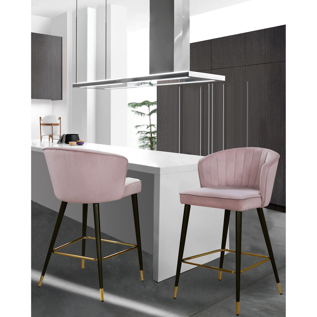 Give your kitchen counter a fresh new look with this Cassie Pink Velvet Stool. The shell-shaped back and channel tufted design draw the eye, making this stool an attention-commanding addition to your space. The sleek black metal legs flare slightly to create a modish silhouette, while goldtone tips on the ends and a goldtone foot rail complete the look. Rich velvet in a neutral hue makes it easy to blend this stool in easily with any color scheme.