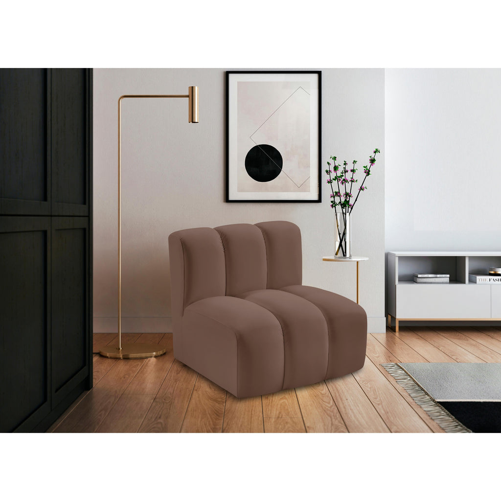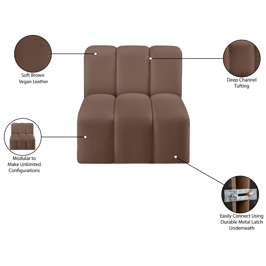 Unleash modern opulence with the Arc Vegan Leather Straight Chair. Crafted for the modern connoisseur, this chair injects an air of refined luxury into any space. Its sleek silhouette, upholstered in supple brown vegan leather, exudes timeless sophistication while the deep channel tufting adds textural intrigue, further elevating the chair's visual appeal. The modular design makes it a versatile chameleon, effortlessly adapting to your evolving needs and preferences. Whether you envision it gracing a chic living room corner, basking in the glow of a bedroom window, or adding a touch of drama to a home office, the Arc seamlessly complements your unique interior aesthetic.