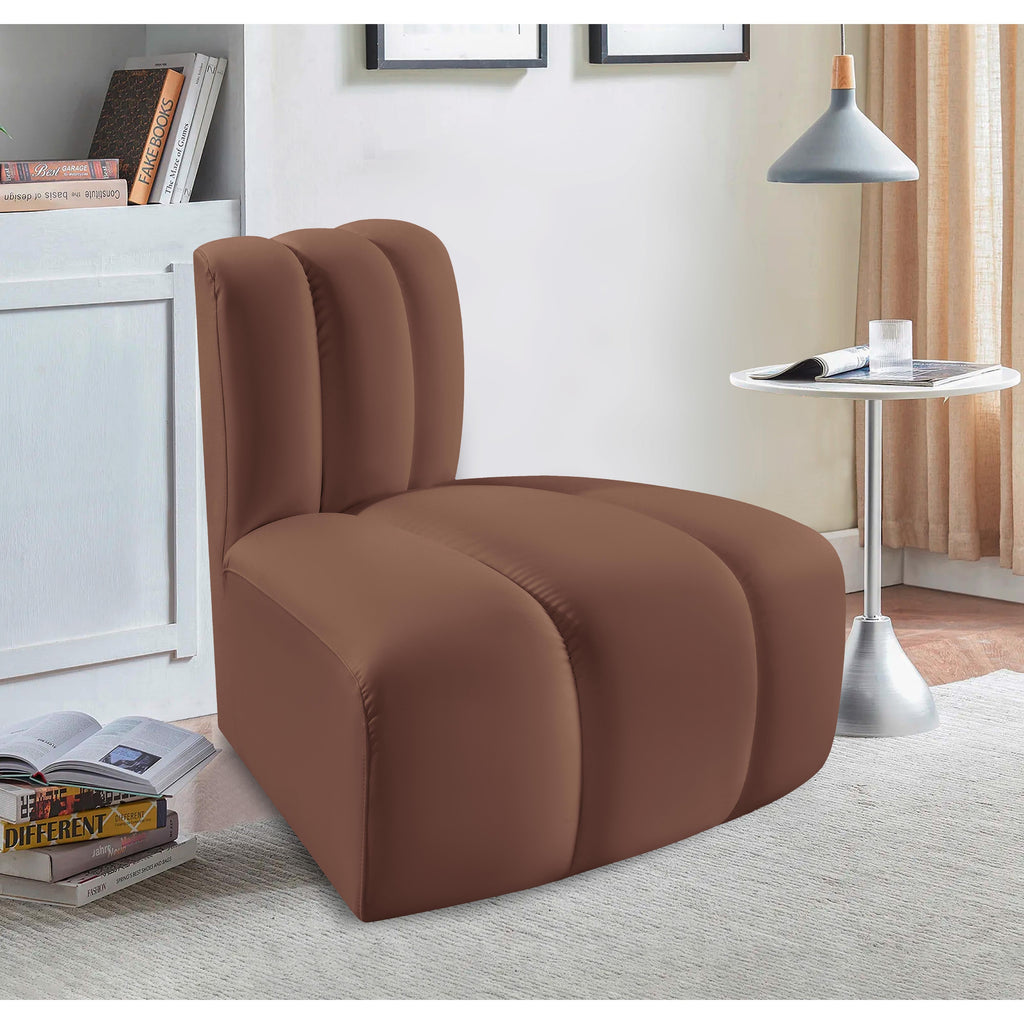 Unleash modern opulence with the Arc Vegan Leather Reversed Corner. Crafted for the modern connoisseur, this chair injects an air of refined luxury into any space. Its sleek silhouette, upholstered in supple cognac vegan leather, exudes timeless sophistication while the deep channel tufting adds textural intrigue, further elevating the chair's visual appeal. The modular design makes it a versatile chameleon, effortlessly adapting to your evolving needs and preferences. Whether you envision it gracing a chic living room corner, basking in the glow of a bedroom window, or adding a touch of drama to a home office, the Arc seamlessly complements your unique interior aesthetic.
