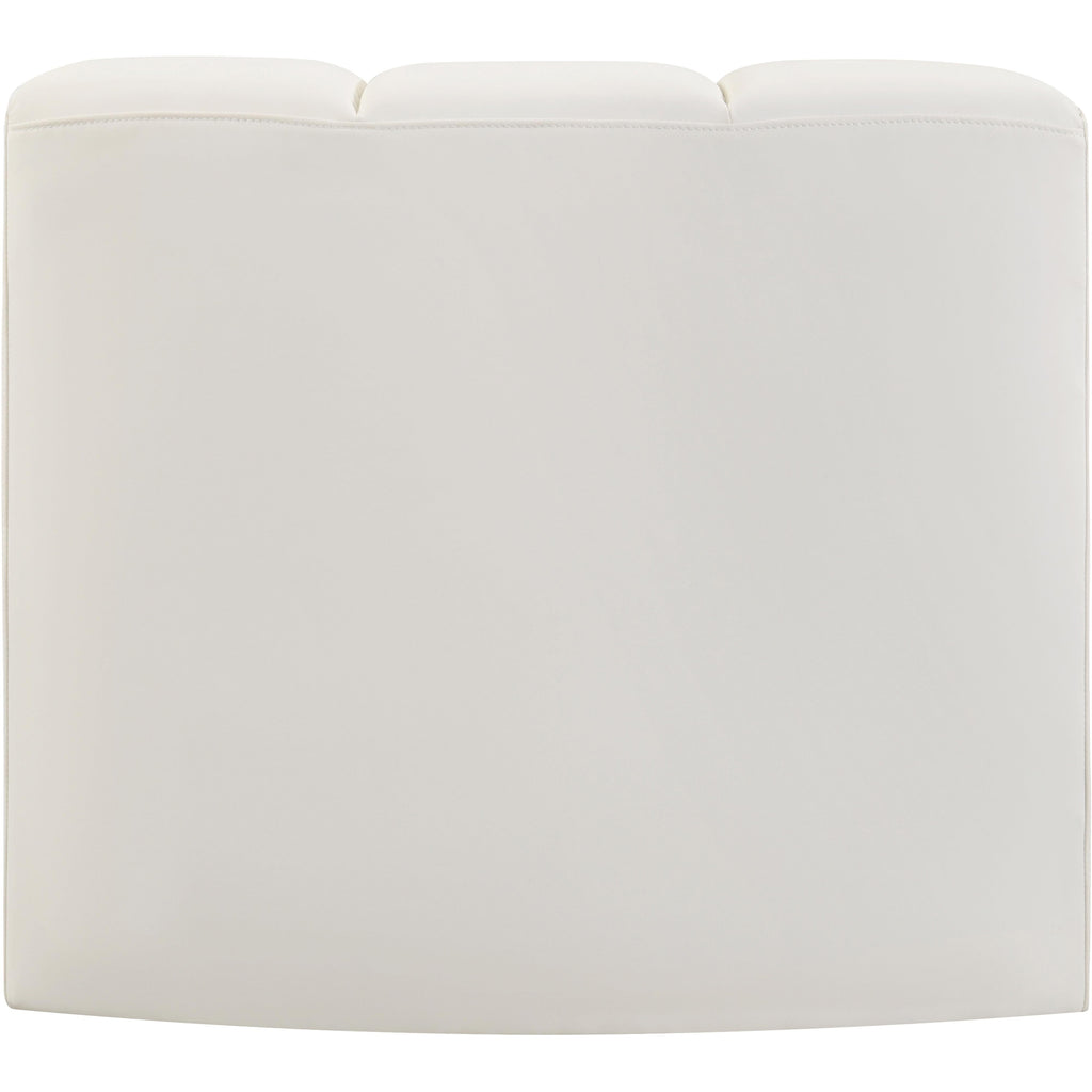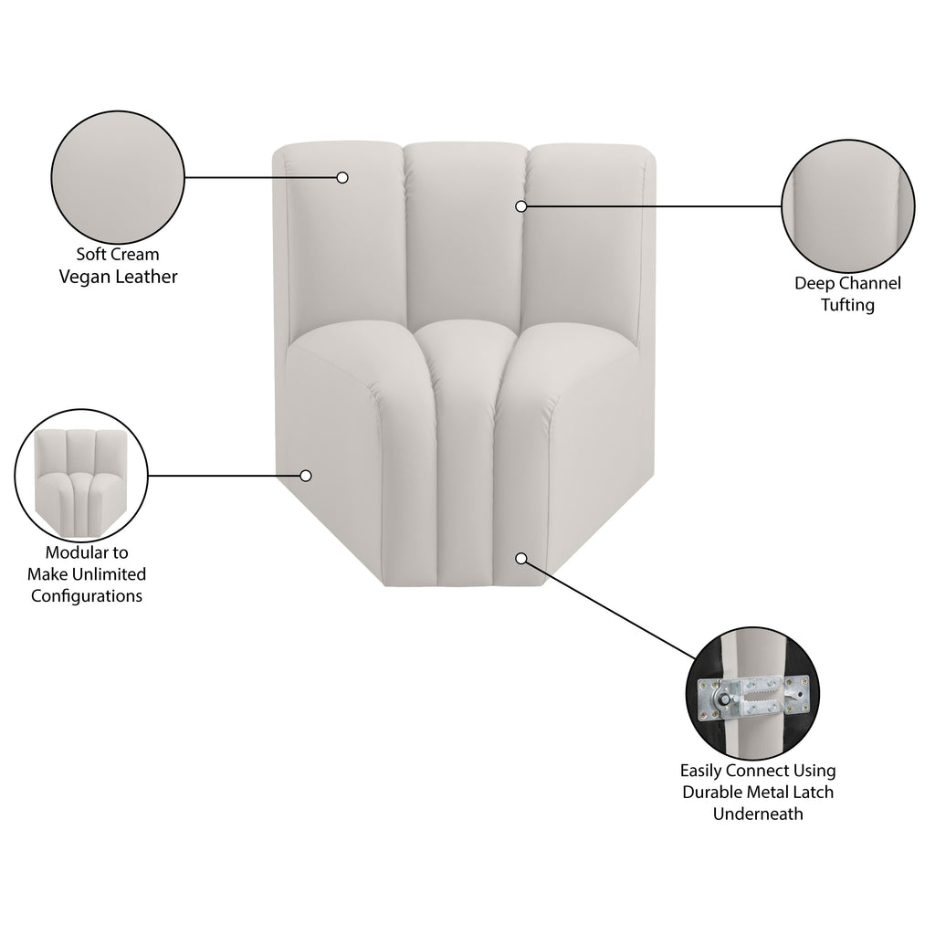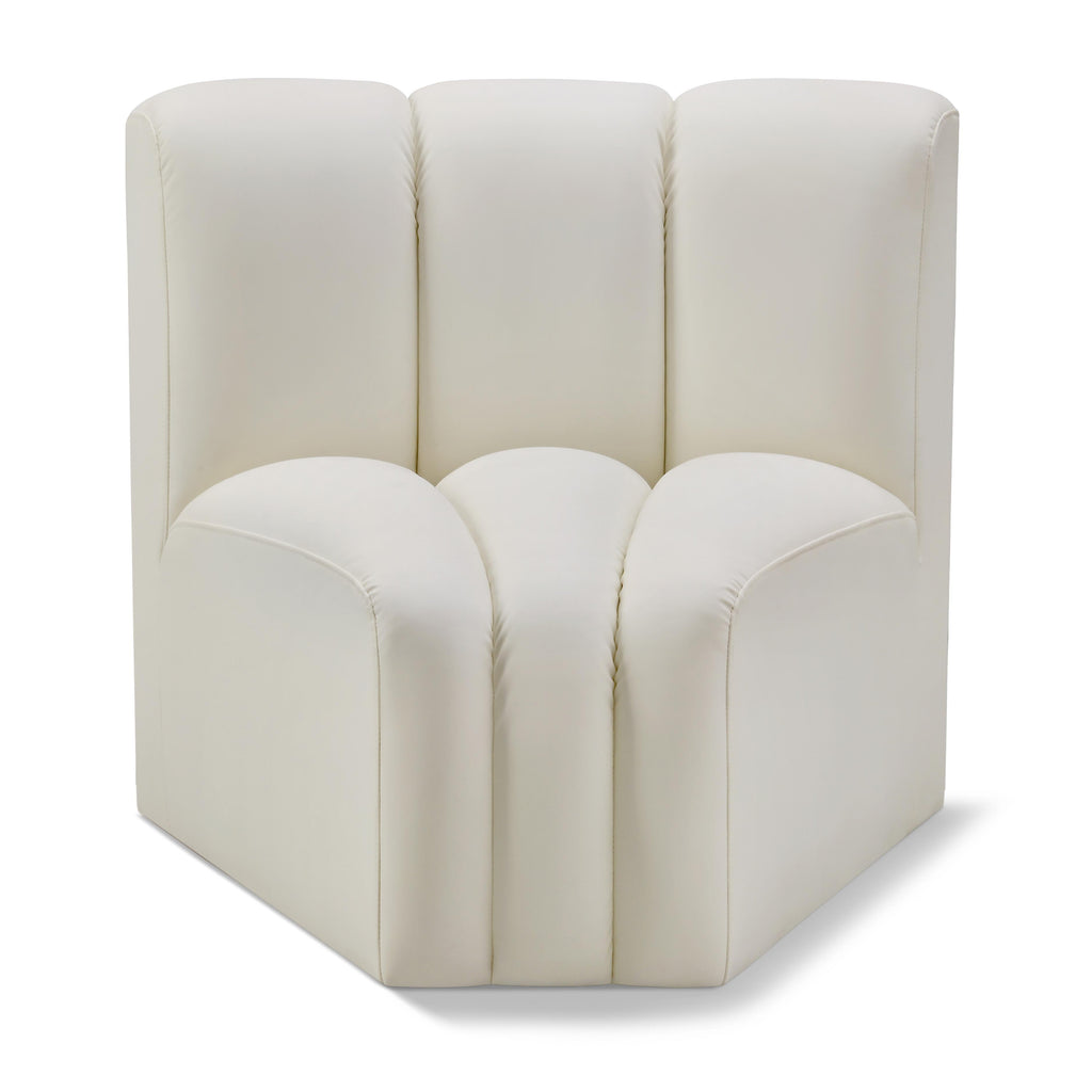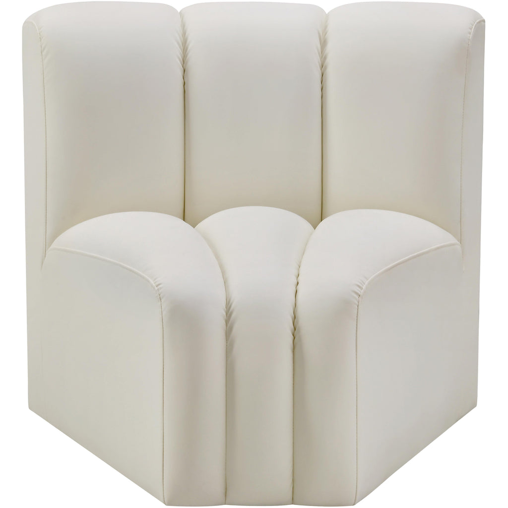 Unleash modern opulence with the Arc Vegan Leather Curved Corner. Crafted for the modern connoisseur, this chair injects an air of refined luxury into any space. Its sleek silhouette, upholstered in supple cream vegan leather, exudes timeless sophistication while the deep channel tufting adds textural intrigue, further elevating the chair's visual appeal. The modular design makes it a versatile chameleon, effortlessly adapting to your evolving needs and preferences. Whether you envision it gracing a chic living room corner, basking in the glow of a bedroom window, or adding a touch of drama to a home office, the Arc seamlessly complements your unique interior aesthetic.