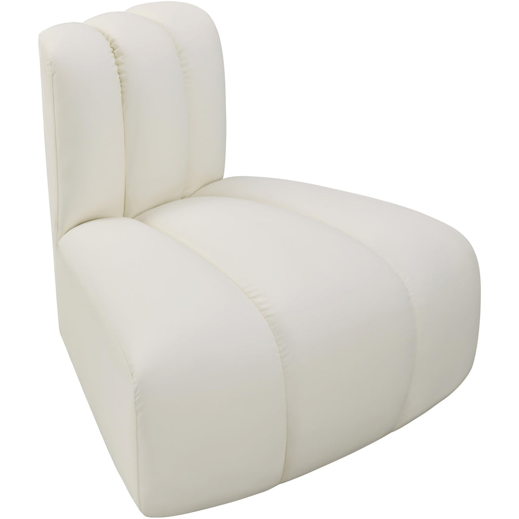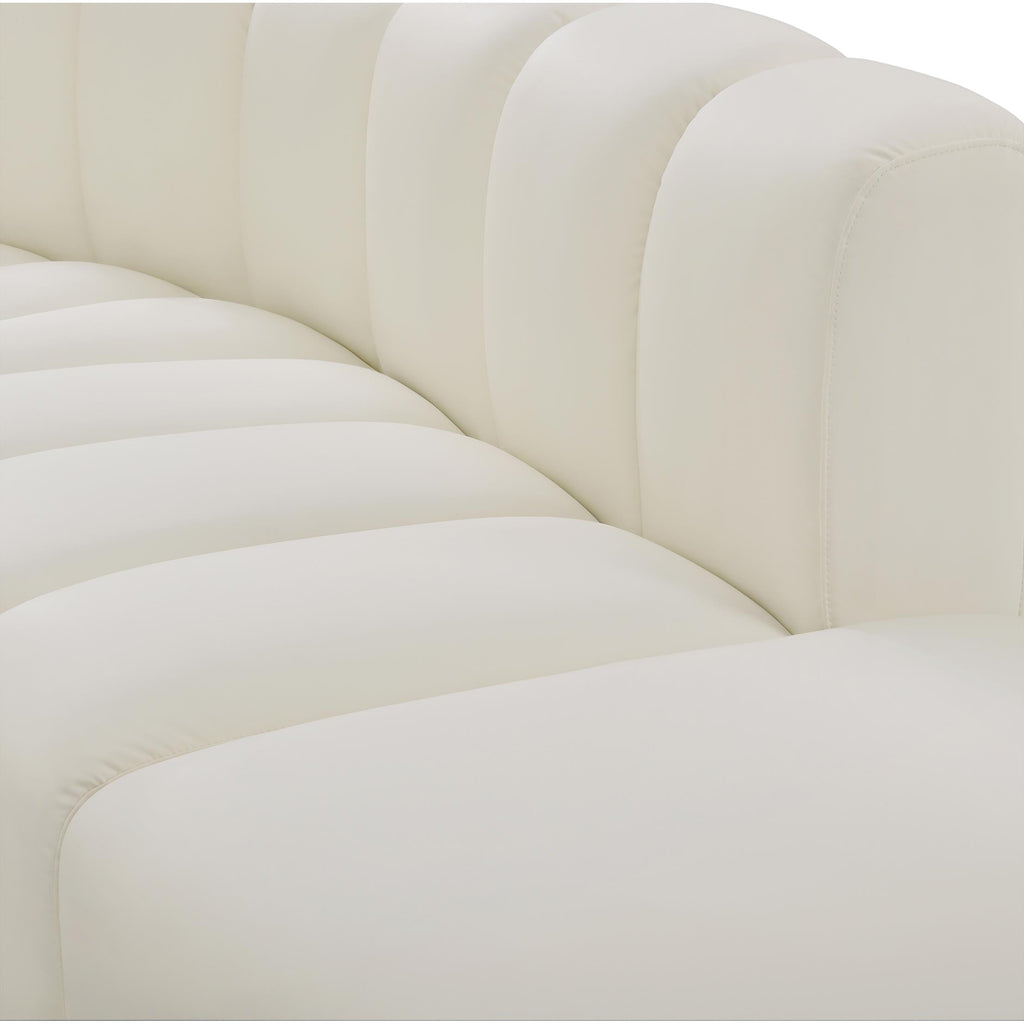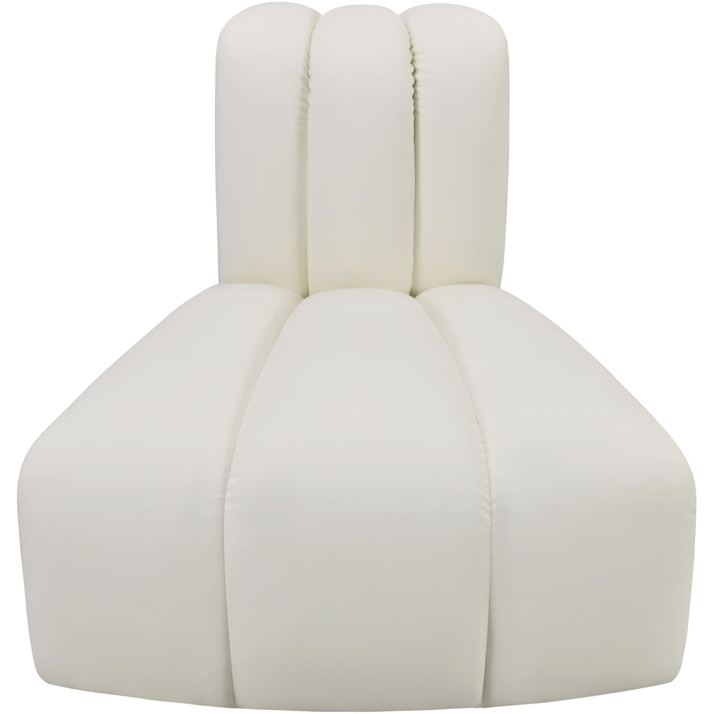 Unleash modern opulence with the Arc Vegan Leather Reversed Corner. Crafted for the modern connoisseur, this chair injects an air of refined luxury into any space. Its sleek silhouette, upholstered in supple cream vegan leather, exudes timeless sophistication while the deep channel tufting adds textural intrigue, further elevating the chair's visual appeal. The modular design makes it a versatile chameleon, effortlessly adapting to your evolving needs and preferences. Whether you envision it gracing a chic living room corner, basking in the glow of a bedroom window, or adding a touch of drama to a home office, the Arc seamlessly complements your unique interior aesthetic.