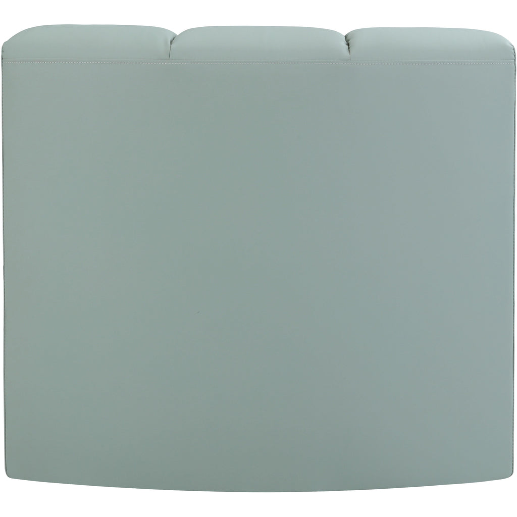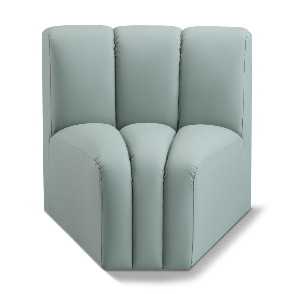 Unleash modern opulence with the Arc Vegan Leather Curved Corner. Crafted for the modern connoisseur, this chair injects an air of refined luxury into any space. Its sleek silhouette, upholstered in supple mint green vegan leather, exudes timeless sophistication while the deep channel tufting adds textural intrigue, further elevating the chair's visual appeal. The modular design makes it a versatile chameleon, effortlessly adapting to your evolving needs and preferences. Whether you envision it gracing a chic living room corner, basking in the glow of a bedroom window, or adding a touch of drama to a home office, the Arc seamlessly complements your unique interior aesthetic.