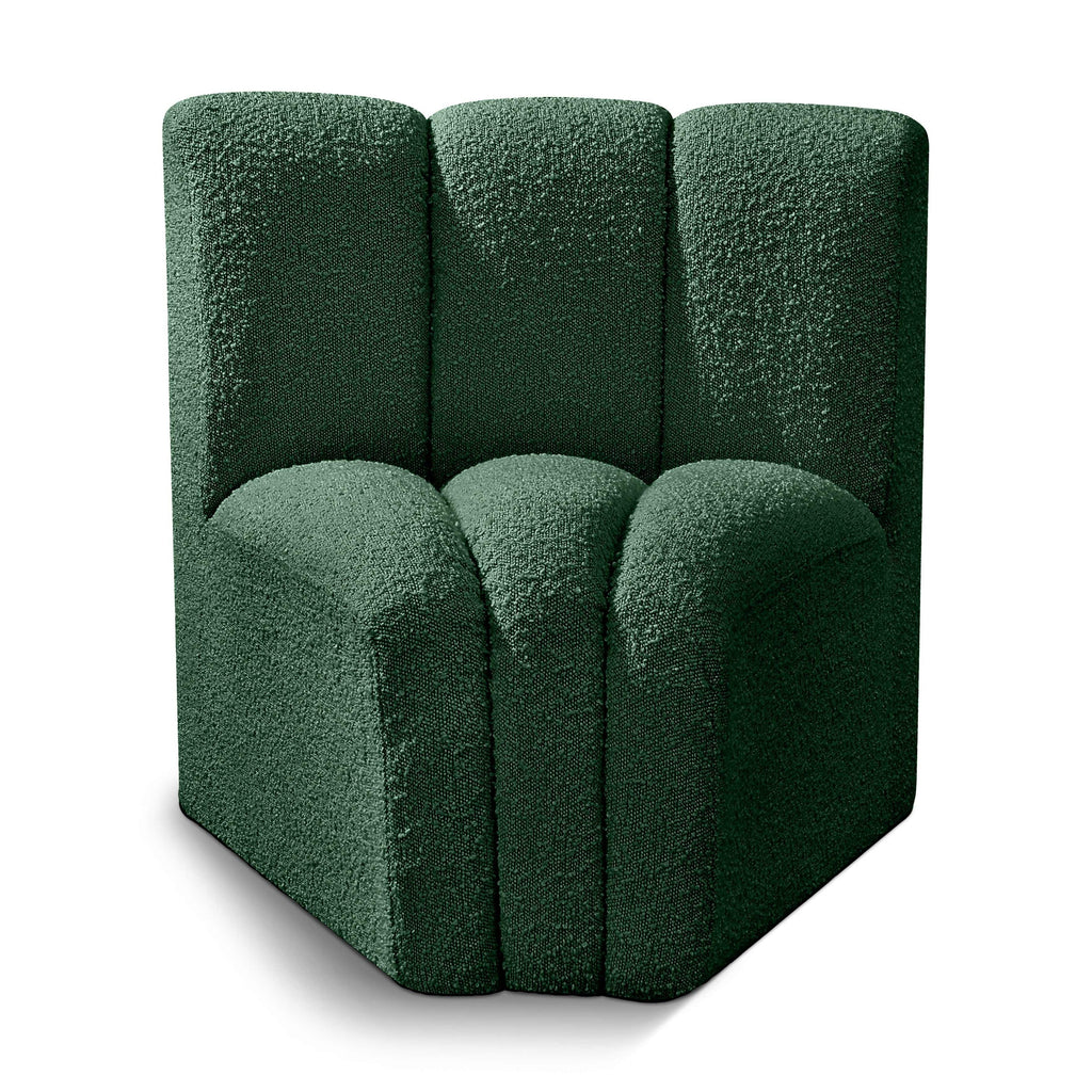 Give your living room or den the perfect blend of style and versatility with this Arc boucle fabric curved corner chair. Part of the Arc modular furniture collection, this chair comes upholstered in rich green boucle fabric and features deep channel tufting that adds a touch of luxury while enhancing comfort and support. A seamless combination of form and function, this chair can be used with other Arc pieces to create a myriad of configurations in your well-curated room.