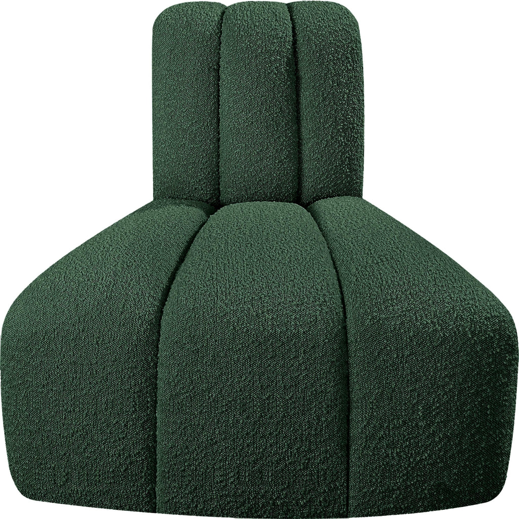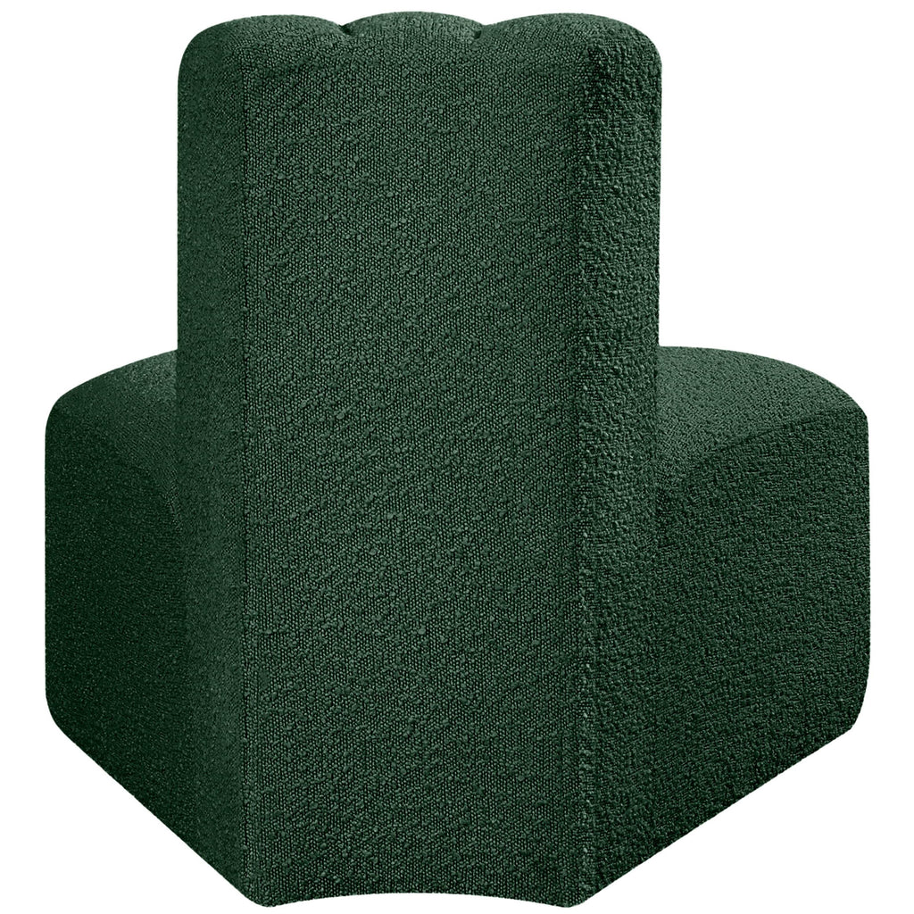 Give your living room or den the perfect blend of style and versatility with this Arc boucle fabric curved reverse corner chair. Part of the Arc modular furniture collection, this chair comes upholstered in rich green boucle fabric and features deep channel tufting that adds a touch of luxury while enhancing comfort and support. A seamless combination of form and function, this chair can be used with other Arc pieces to create a myriad of configurations in your well-curated room.