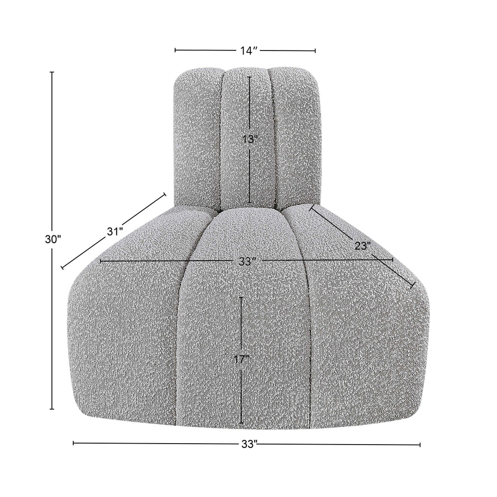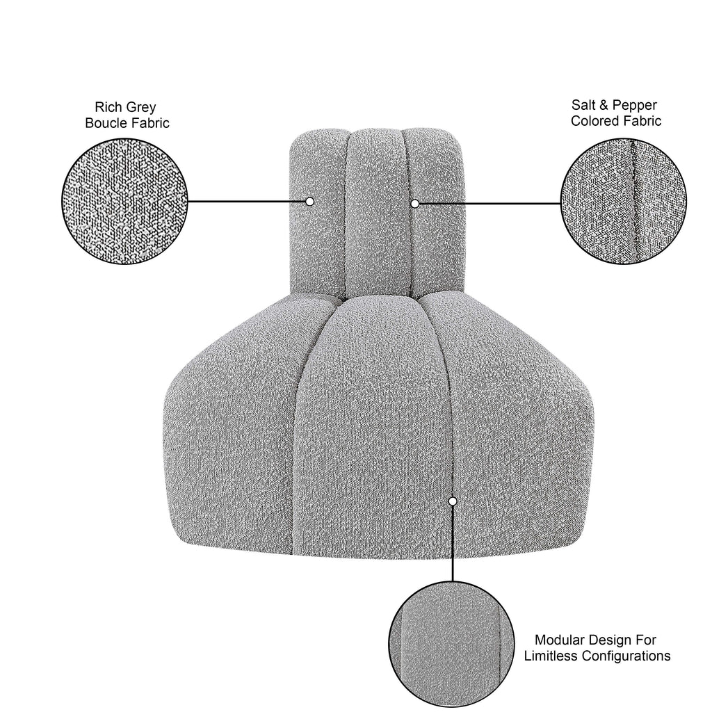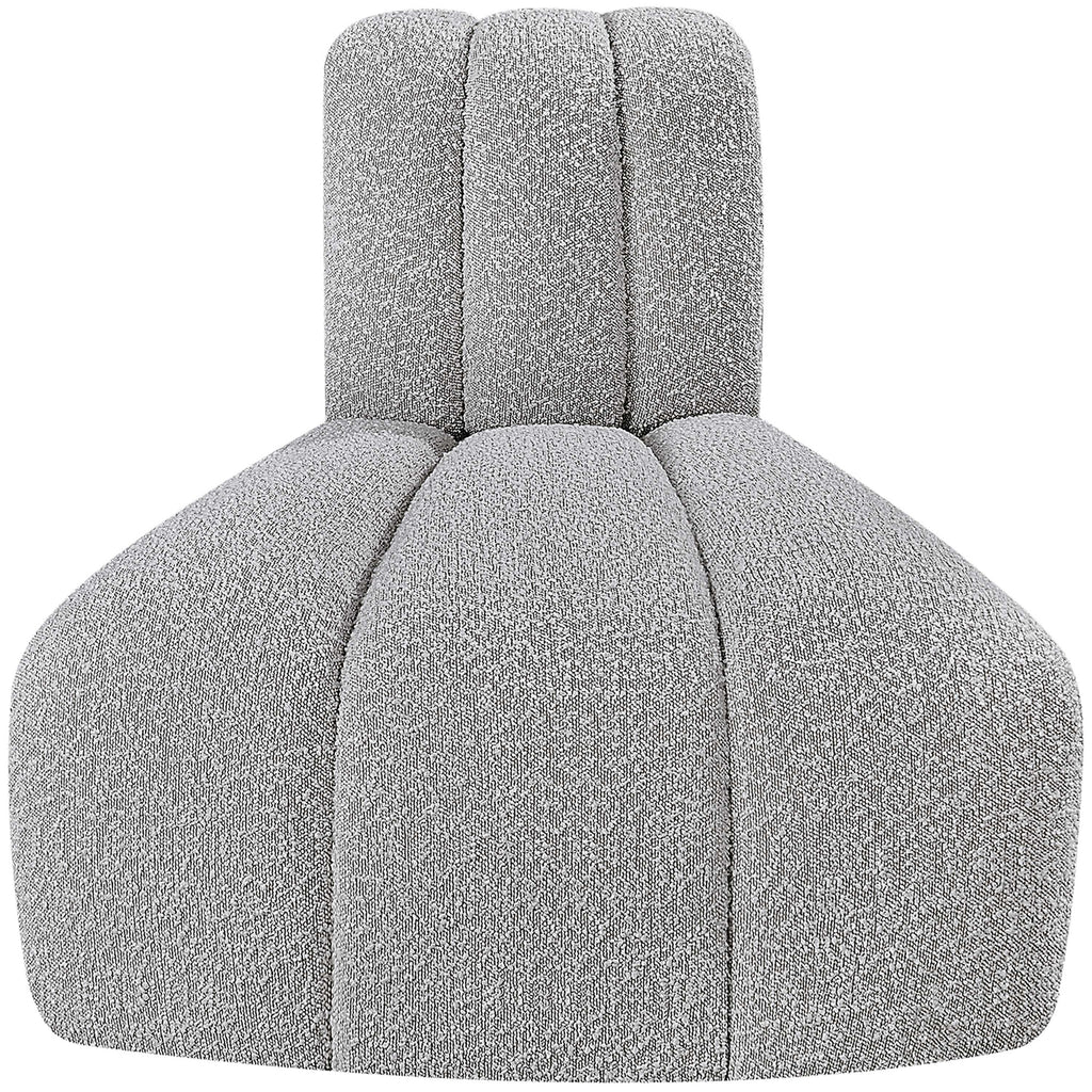 Give your living room or den the perfect blend of style and versatility with this Arc boucle fabric curved reverse corner chair. Part of the Arc modular furniture collection, this chair comes upholstered in rich grey boucle fabric and features deep channel tufting that adds a touch of luxury while enhancing comfort and support. A seamless combination of form and function, this chair can be used with other Arc pieces to create a myriad of configurations in your well-curated room.