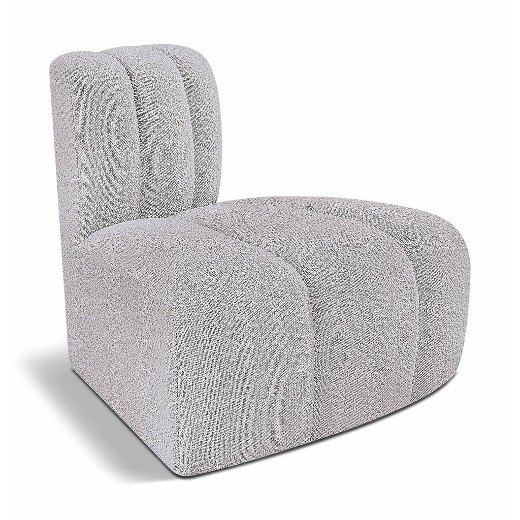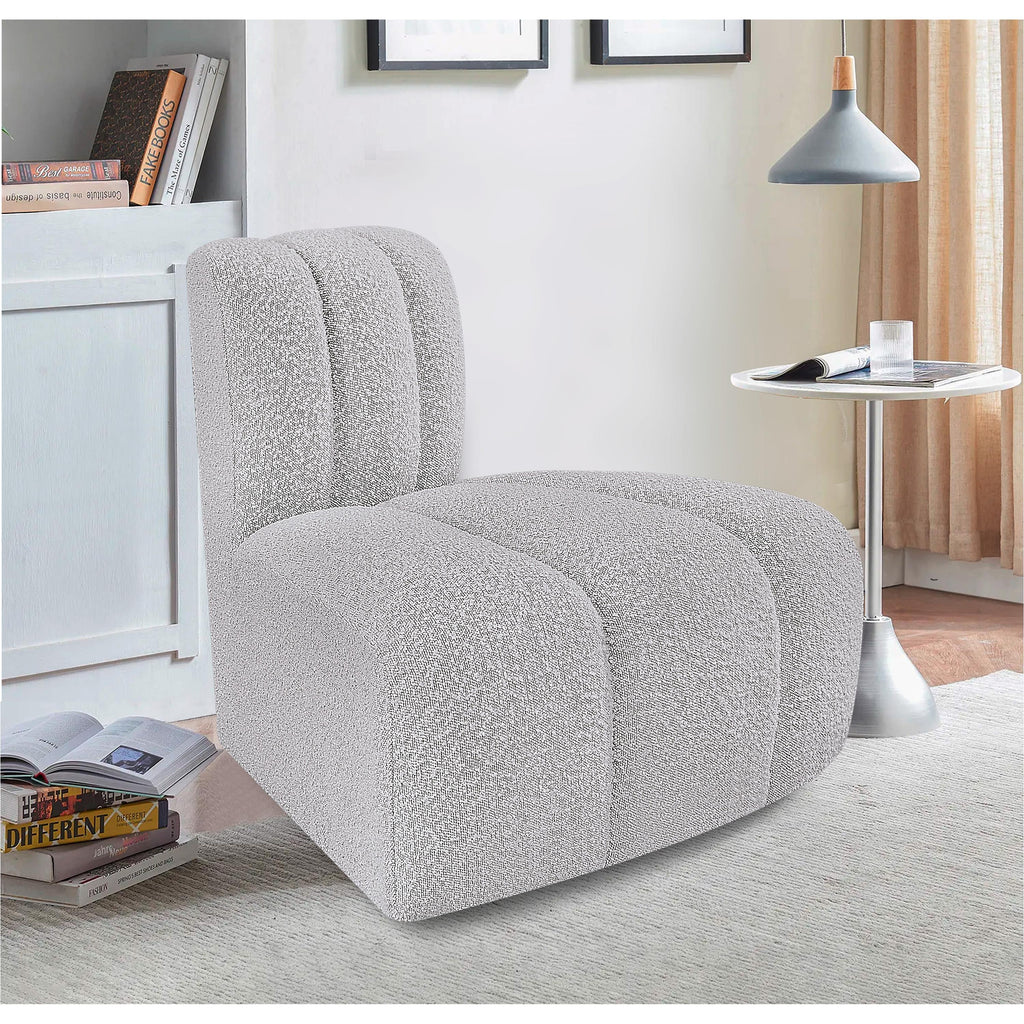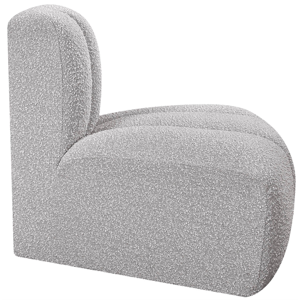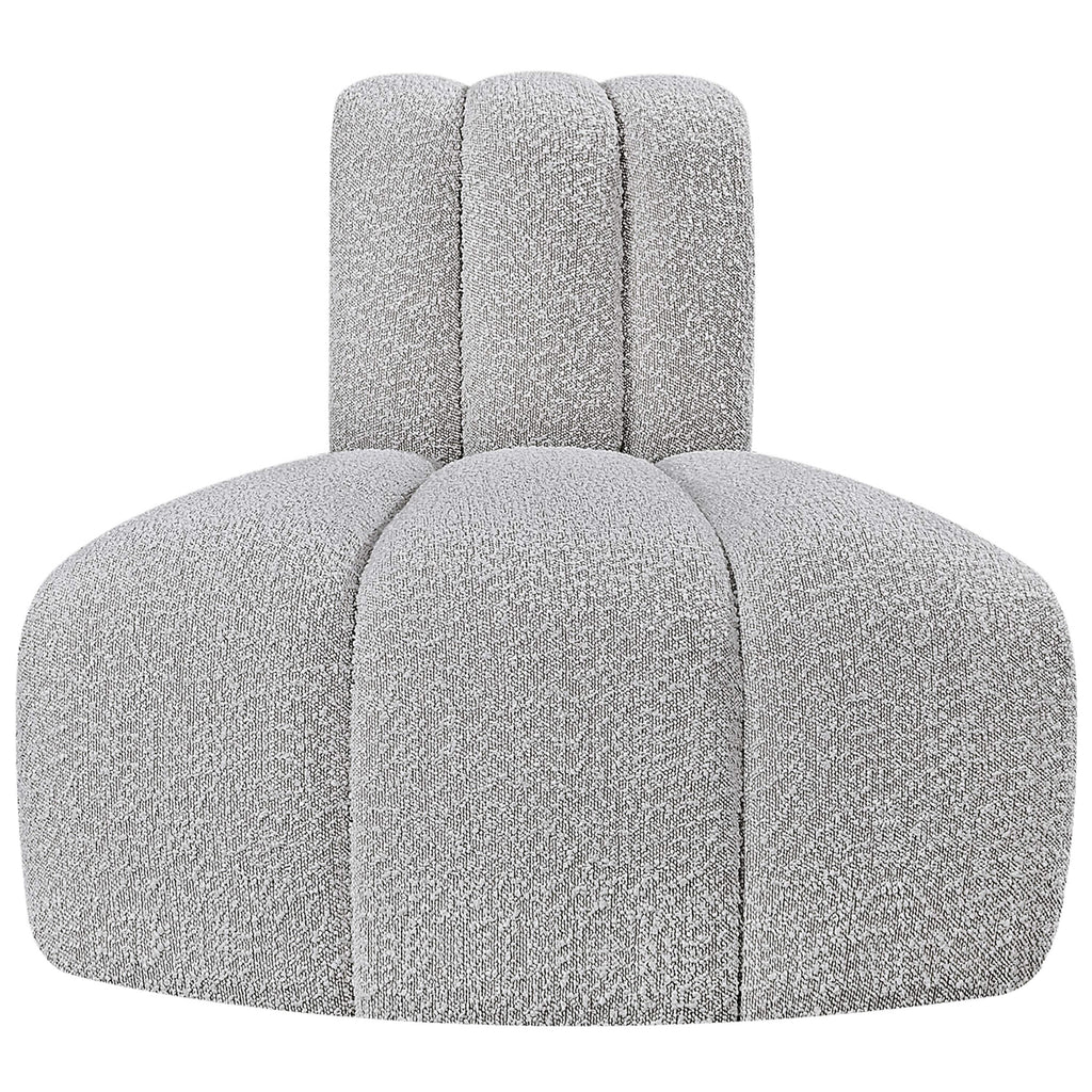 Give your living room or den the perfect blend of style and versatility with this Arc boucle fabric curved reverse corner chair. Part of the Arc modular furniture collection, this chair comes upholstered in rich grey boucle fabric and features deep channel tufting that adds a touch of luxury while enhancing comfort and support. A seamless combination of form and function, this chair can be used with other Arc pieces to create a myriad of configurations in your well-curated room.