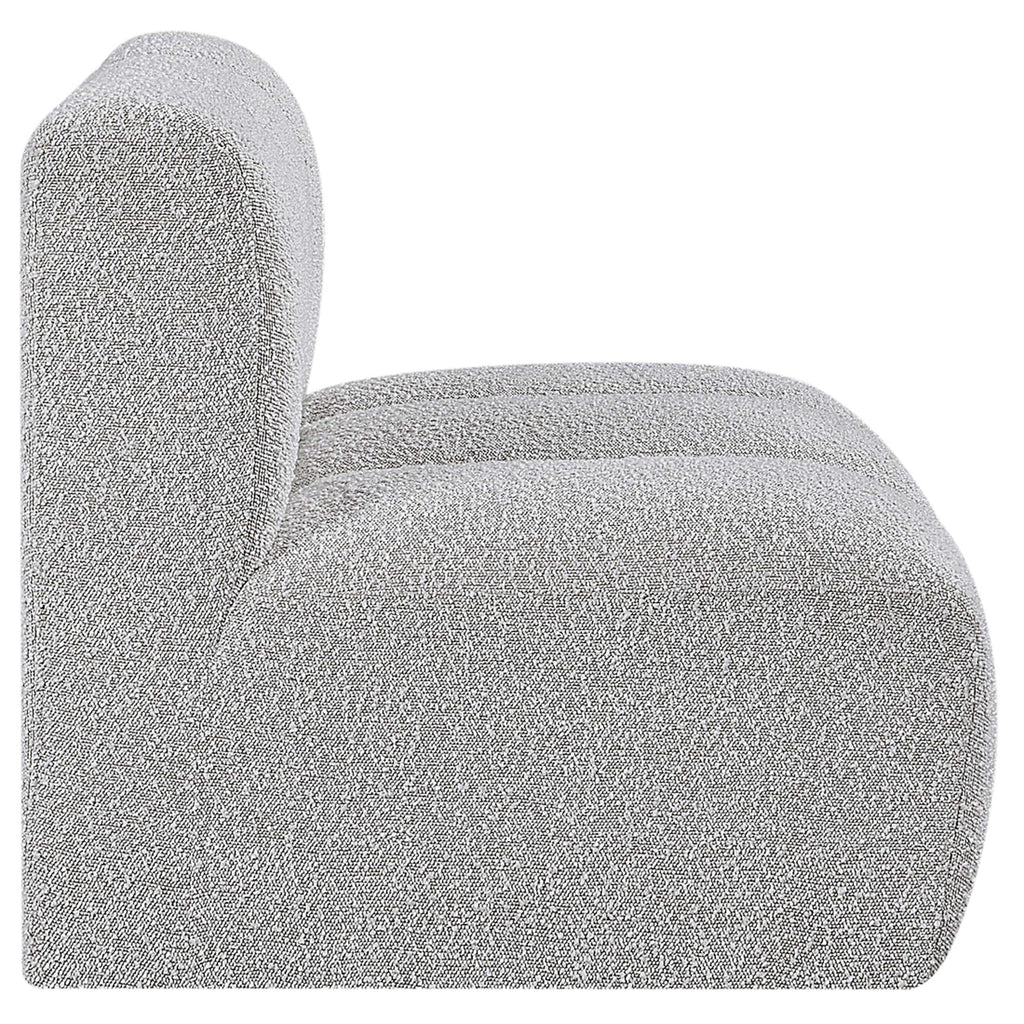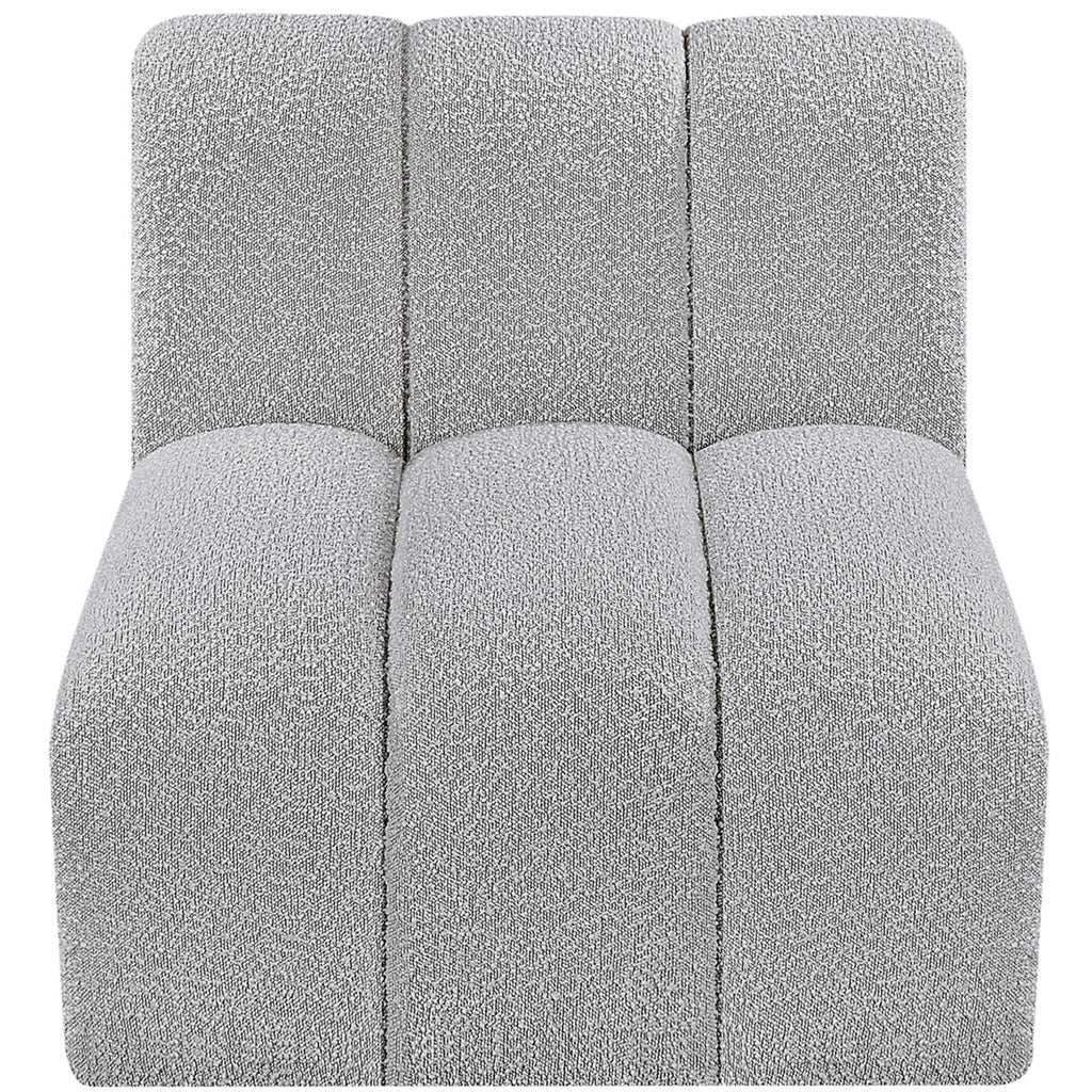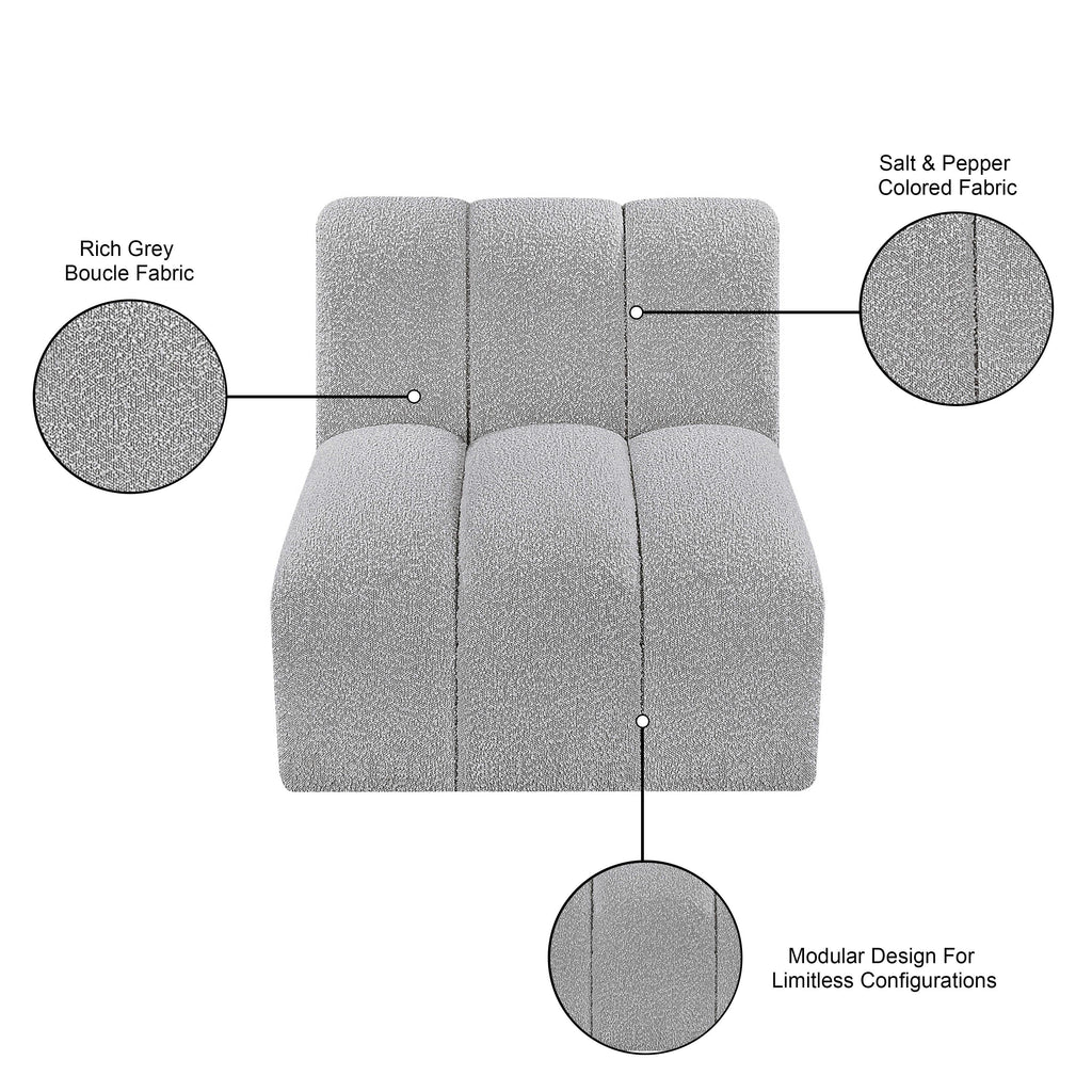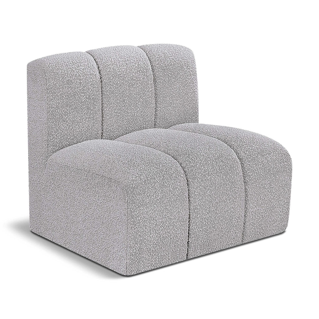 Give your living room or den the perfect blend of style and versatility with this Arc boucle fabric curved straight chair. Part of the Arc modular furniture collection, this sofa comes upholstered in rich grey boucle fabric and features deep channel tufting that adds a touch of luxury while enhancing comfort and support. A seamless combination of form and function, this chair can be used with other Arc pieces to create a myriad of configurations in your well-curated room.