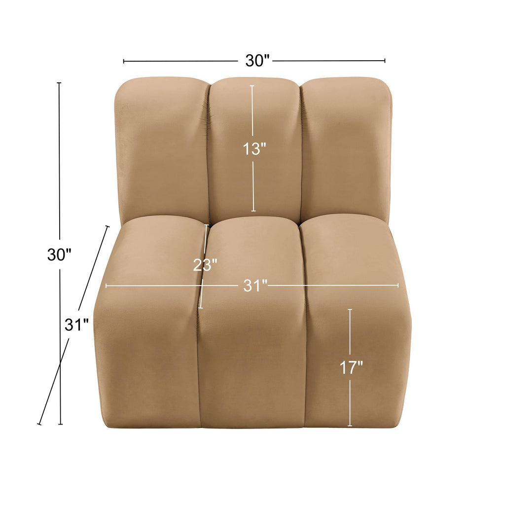 Give your living room or den the perfect blend of style and versatility with this Arc velvet fabric straight chair. Part of the Arc modular furniture collection, this chair comes upholstered in rich camel velvet fabric and features deep channel tufting that adds a touch of luxury while enhancing comfort and support. A seamless combination of form and function, this chair can be used with other Arc pieces to create a myriad of configurations in your well-curated room.