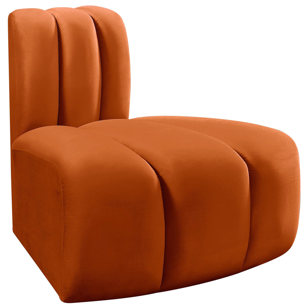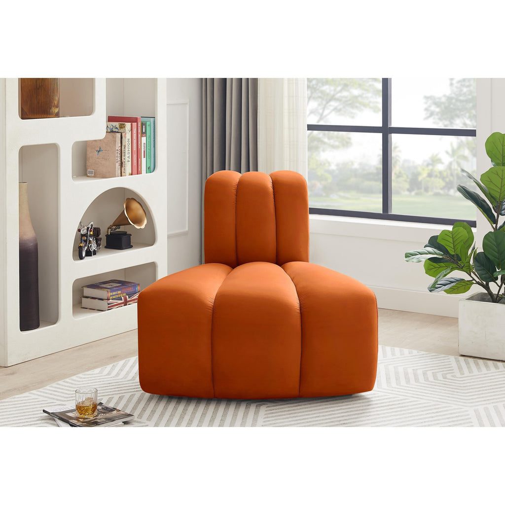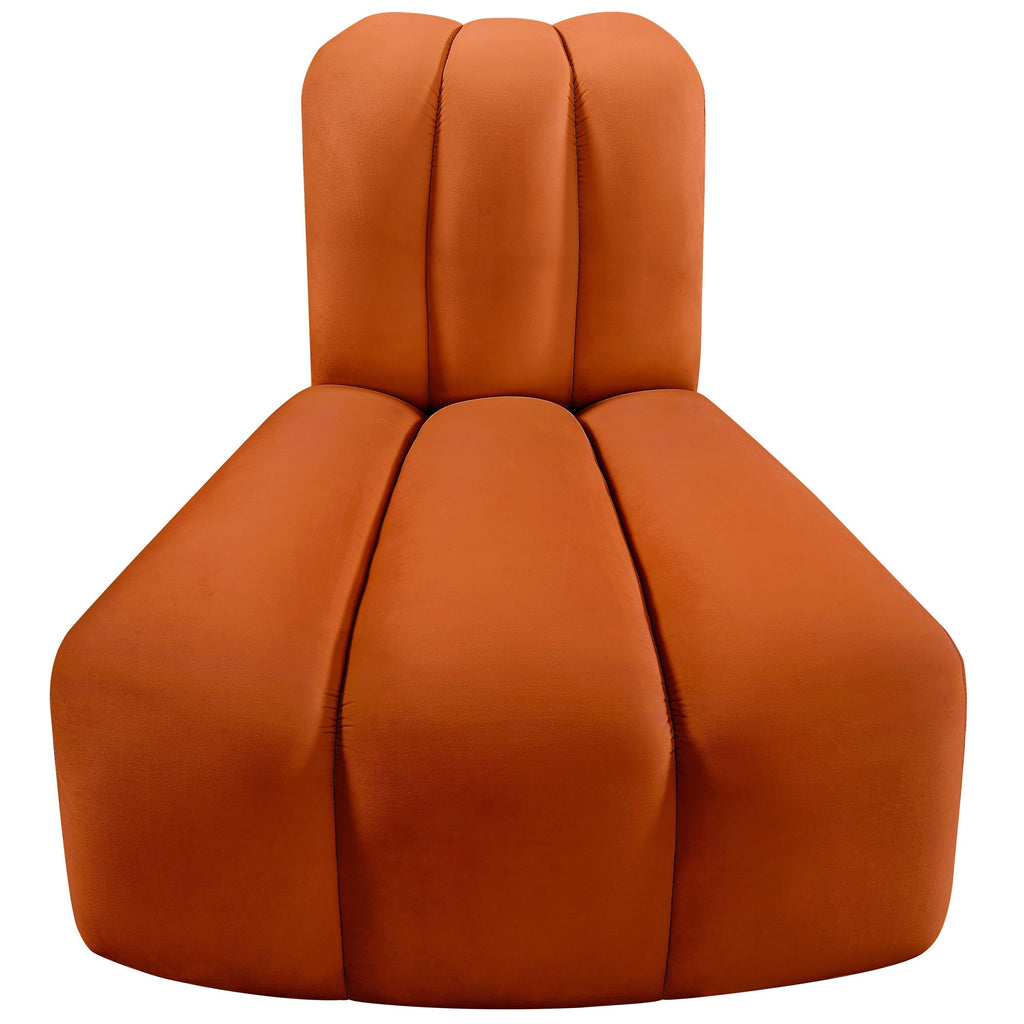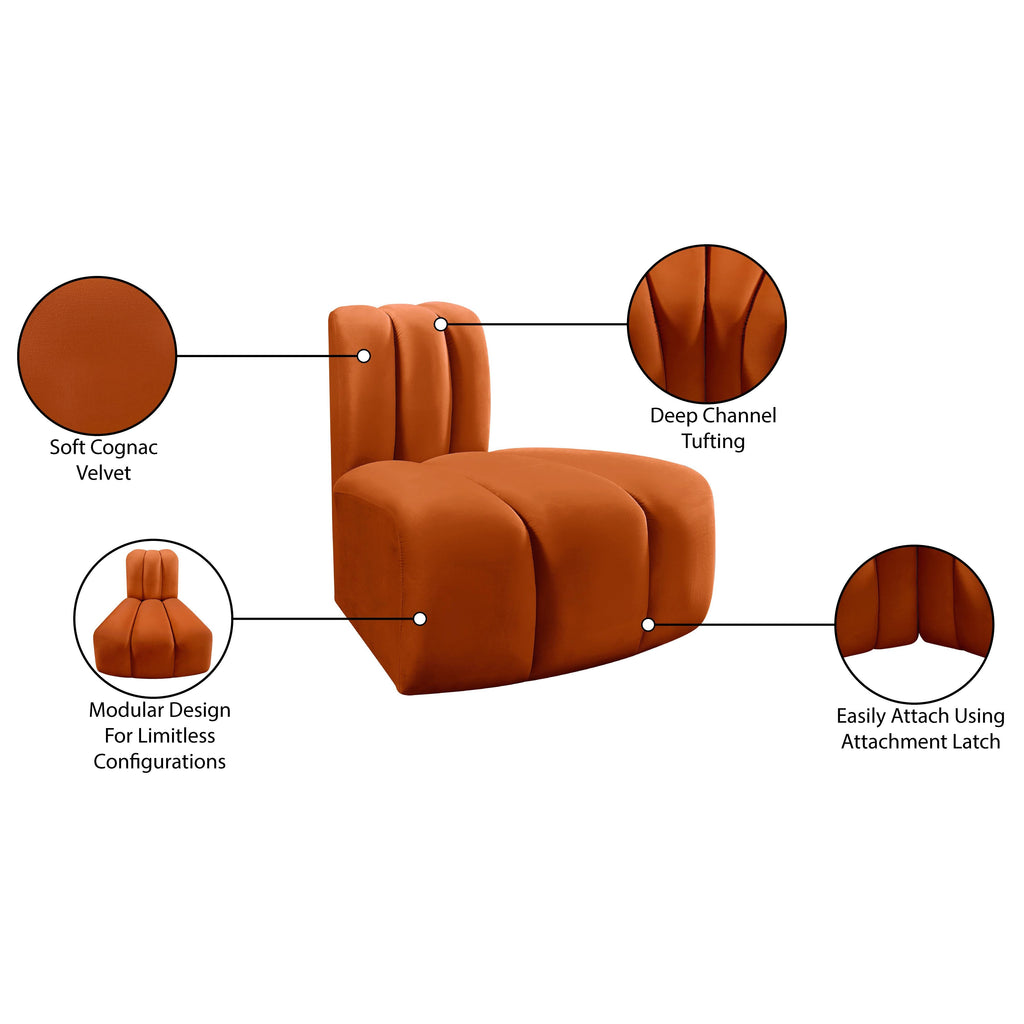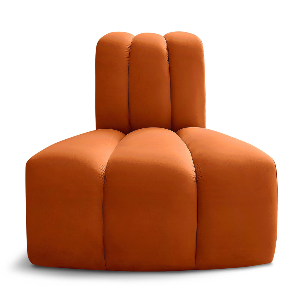 Give your living room or den the perfect blend of style and versatility with this Arc velvet fabric curved reverse corner chair. Part of the Arc modular furniture collection, this chair comes upholstered in rich cognac velvet fabric and features deep channel tufting that adds a touch of luxury while enhancing comfort and support. A seamless combination of form and function, this chair can be used with other Arc pieces to create a myriad of configurations in your well-curated room.