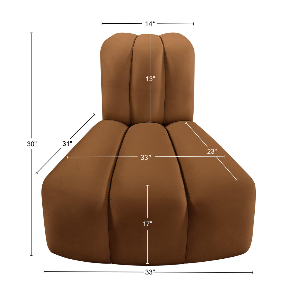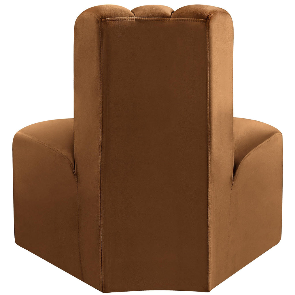 Give your living room or den the perfect blend of style and versatility with this Arc velvet fabric curved reverse corner chair. Part of the Arc modular furniture collection, this chair comes upholstered in rich saddle velvet fabric and features deep channel tufting that adds a touch of luxury while enhancing comfort and support. A seamless combination of form and function, this chair can be used with other Arc pieces to create a myriad of configurations in your well-curated room.