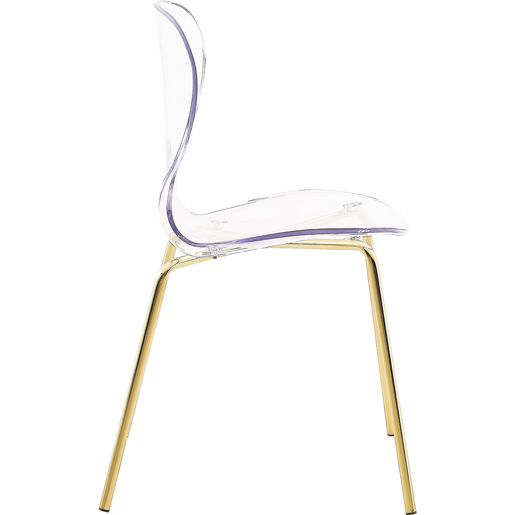 Infuse modernity into your dining room with this Clarion dining chair. A translucent seat and back add a bold and contemporary look to your space while relying on the strength of Lucite polycarbonate to ensure sturdy strength and resilience. A classic metal base with a luxe gold finish contrasts nicely with the translucent top, giving your room a modern vibe that's hard to ignore yet basic and simple at the same time.