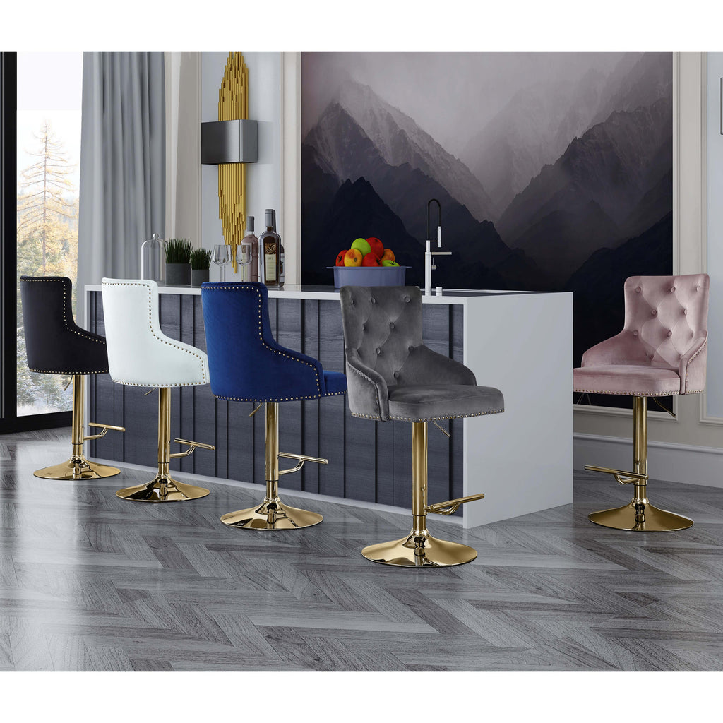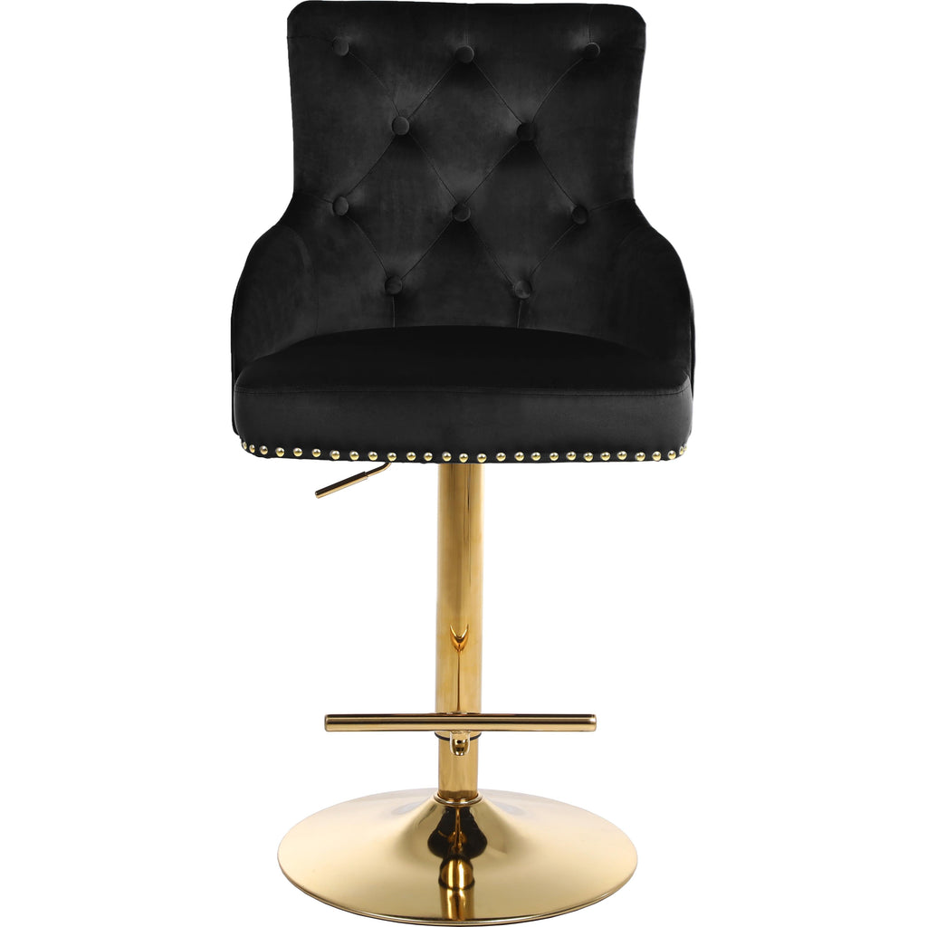 They'll want to stay "till closing time" when you seat them in this Claude velvet adjustable bar or counter stool. This chair is capable of being adjusted to bar or counter height, making it a versatile addition to your home or home bar. The plush black velvet material is elegant and sophisticated, and the gold nailhead trim adds to its regal look. The gold base is uber contemporary, and the addition of a foot rail is a nice touch.