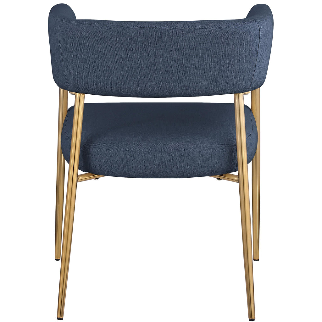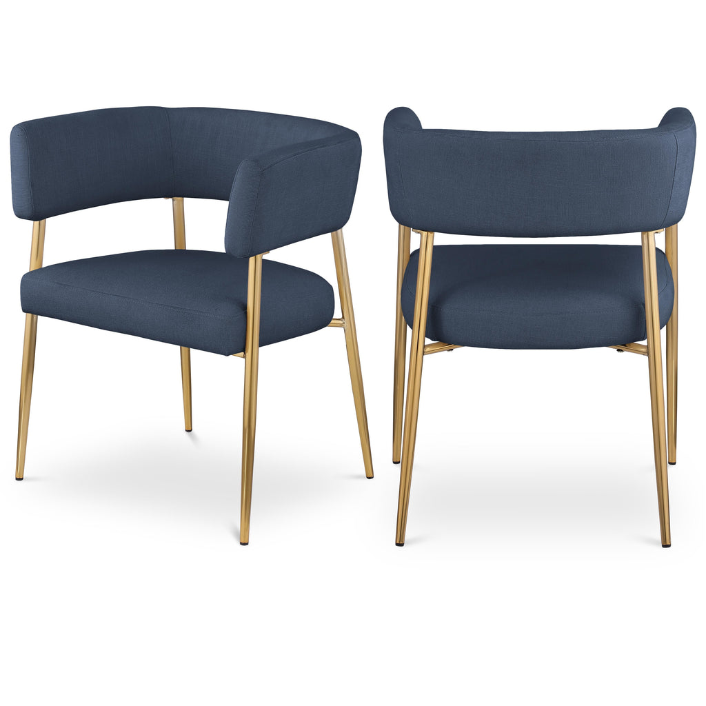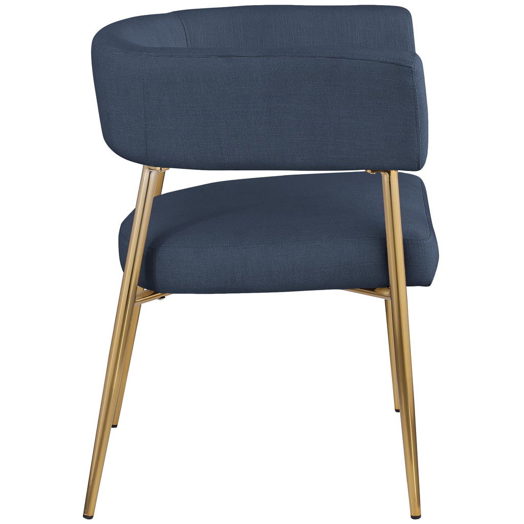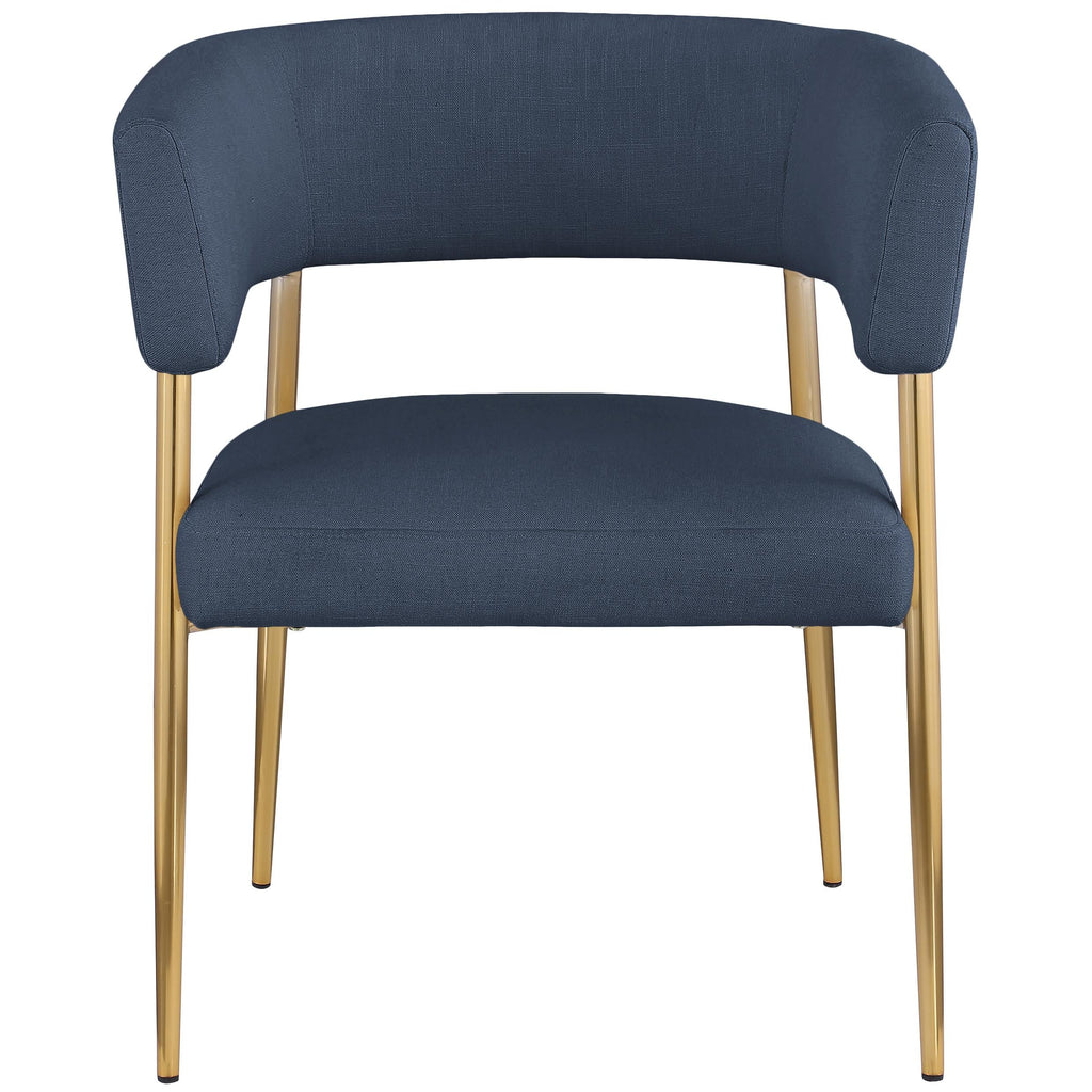 Enliven your dining area with the navy Creston linen textured fabric dining chair. Upholstered in rich navy durable linen textured fabric, this dining chair is not only stylish but also built to last. The brushed gold metal frame adds a touch of luxury, perfectly complementing its contemporary design. The curved back and plush cushioned seat ensure an inviting and comfortable dining experience. Whether it's for daily meals or special occasions, the Creston dining chair combines modern aesthetics with comfort.