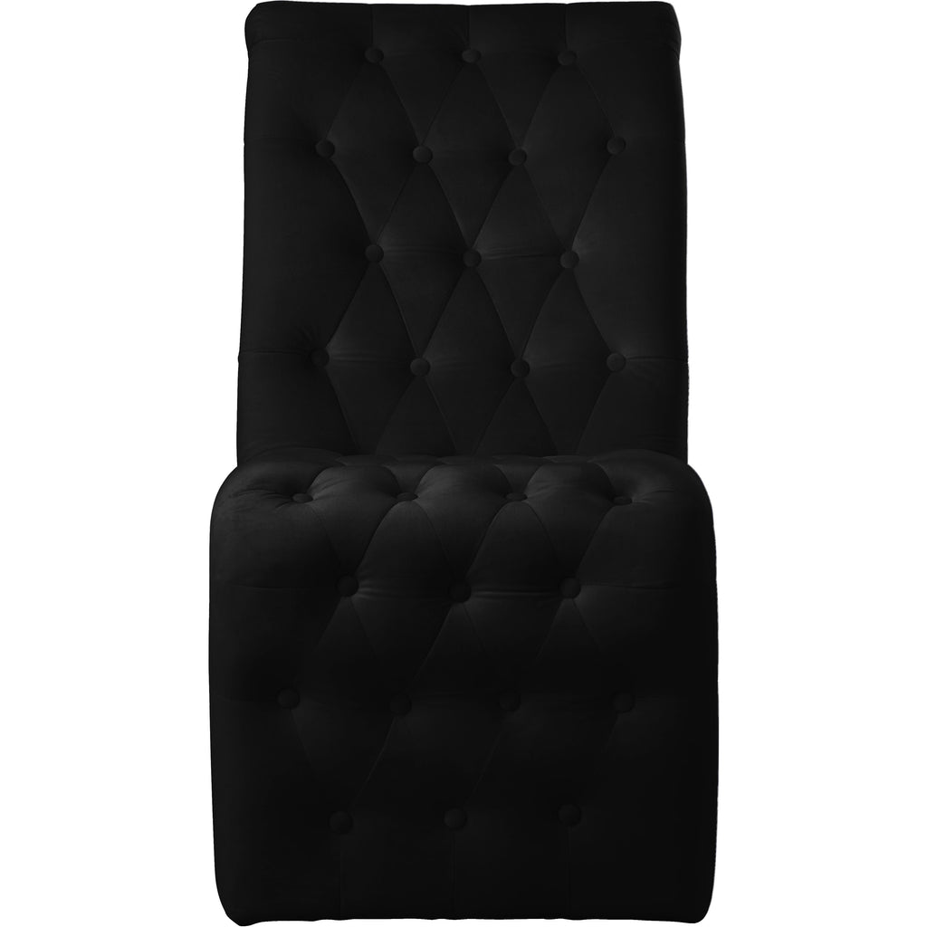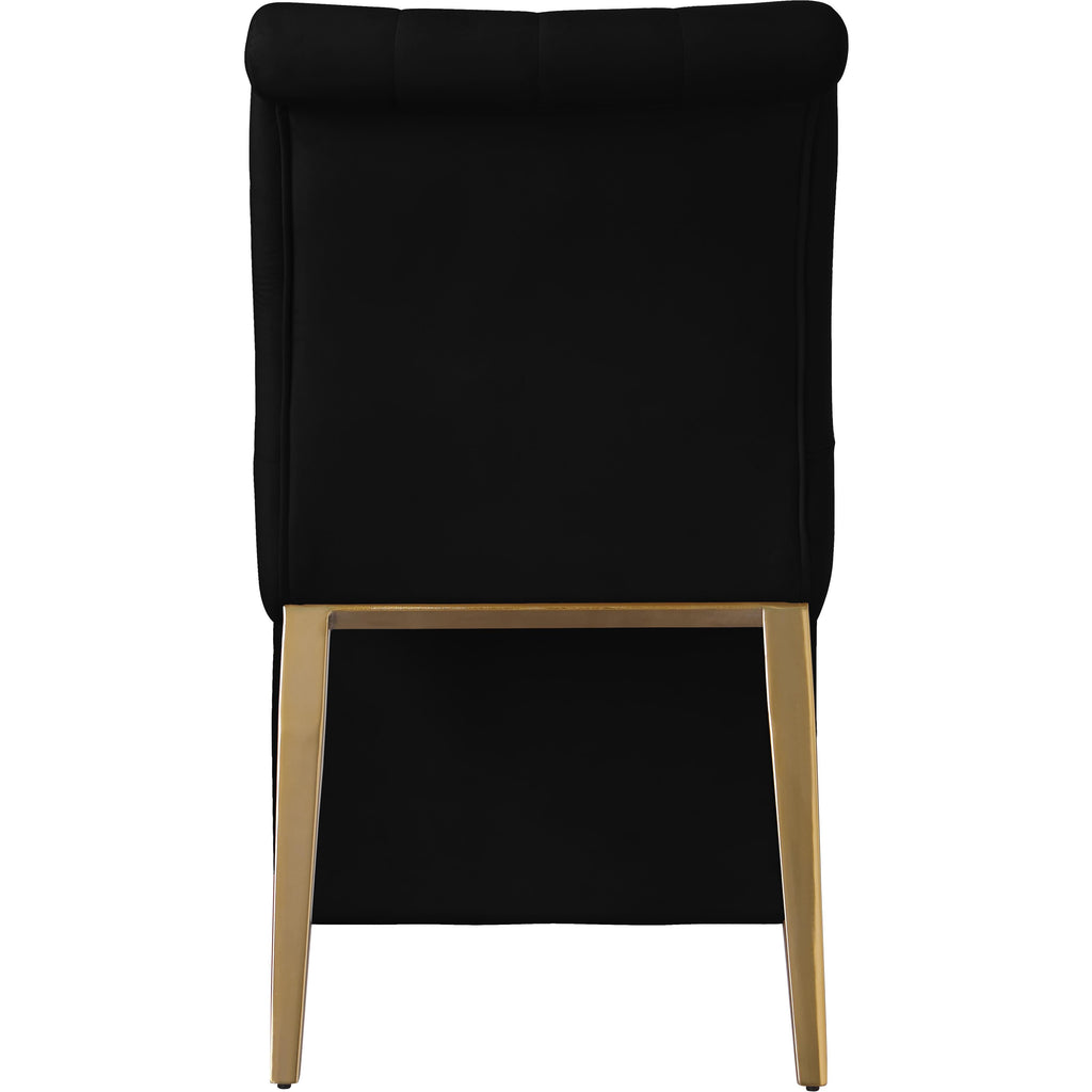 Usher in a new era in your dining room with this Curve velvet dining chair to impress your guests. This chair features an elongated front that sweeps the floor for a look that's luxe to the max. Soft black velvet feels sleek and rich to the touch, giving it a refined and elegant feel. Its rich gold iron legs and detailed button tufting ensure that this chair takes on a decidedly modern vibe.