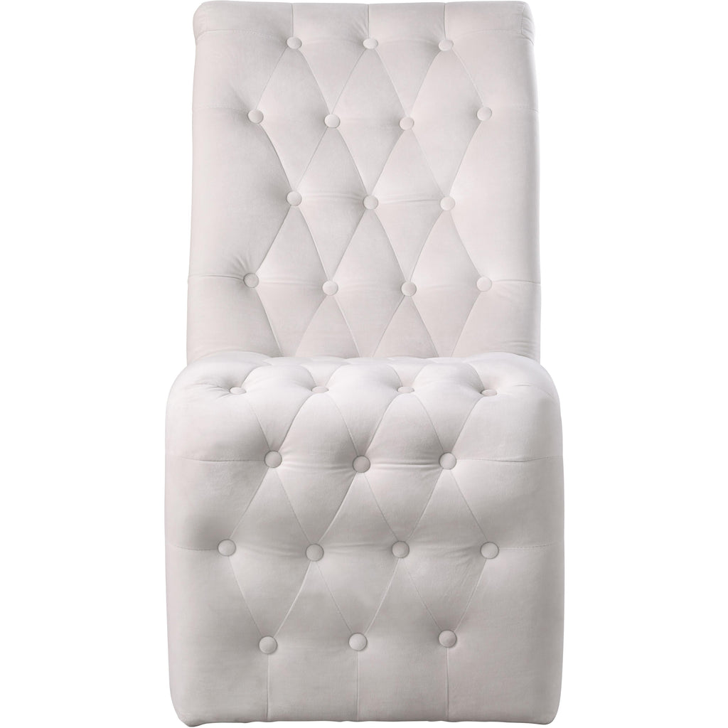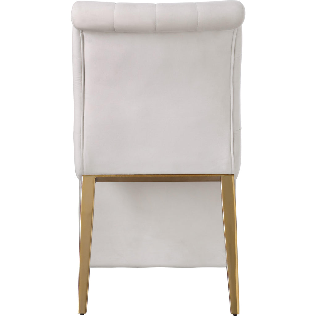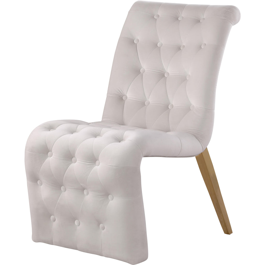 Usher in a new era in your dining room with this Curve velvet dining chair to impress your guests. This chair features an elongated front that sweeps the floor for a look that's luxe to the max. Soft cream velvet feels sleek and rich to the touch, giving it a refined and elegant feel. Its rich gold iron legs and detailed button tufting ensure that this chair takes on a decidedly modern vibe.