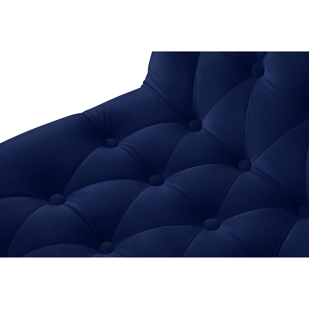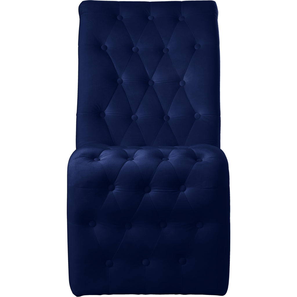 Usher in a new era in your dining room with this Curve velvet dining chair to impress your guests. This chair features an elongated front that sweeps the floor for a look that's luxe to the max. Soft navy velvet feels sleek and rich to the touch, giving it a refined and elegant feel. Its rich gold iron legs and detailed button tufting ensure that this chair takes on a decidedly modern vibe.