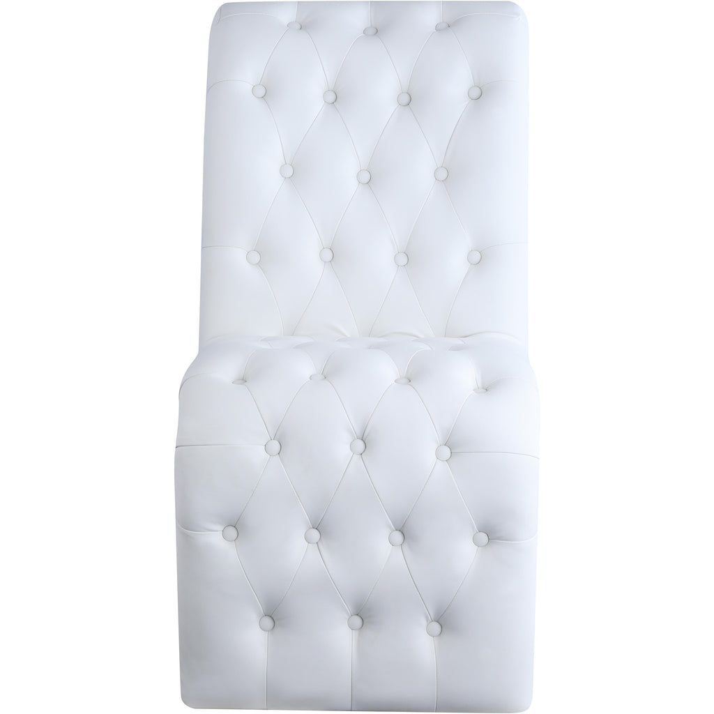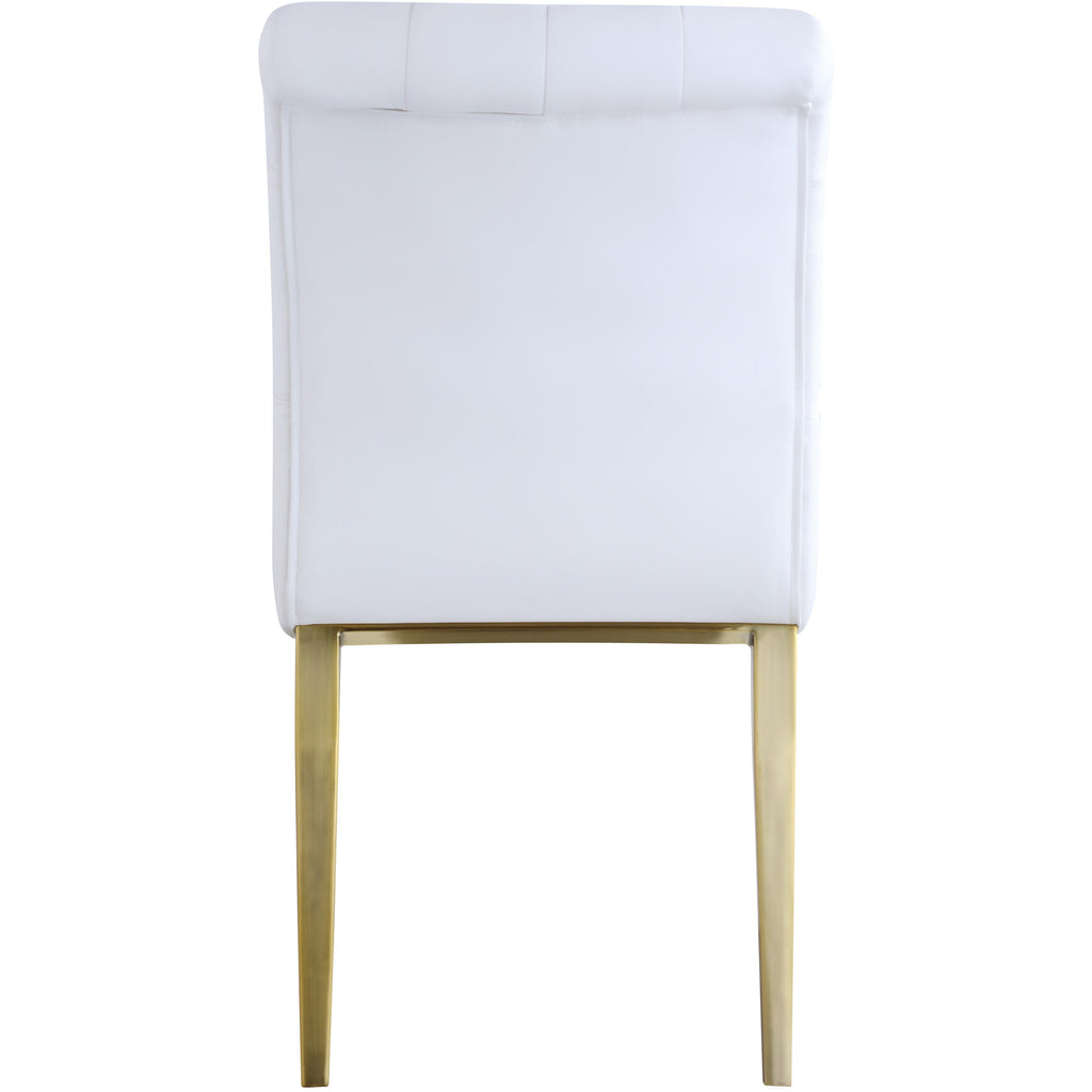 Usher in a new era in your dining room with this Curve vegan leather dining chair to impress your guests. This chair features an elongated front that sweeps the floor for a look that's luxe to the max. Soft and supple white vegan leather feels sleek and rich to the touch, giving it a refined and elegant feel. Its rich gold iron legs and detailed button tufting ensure that this chair takes on a decidedly modern vibe.