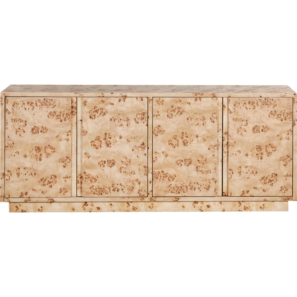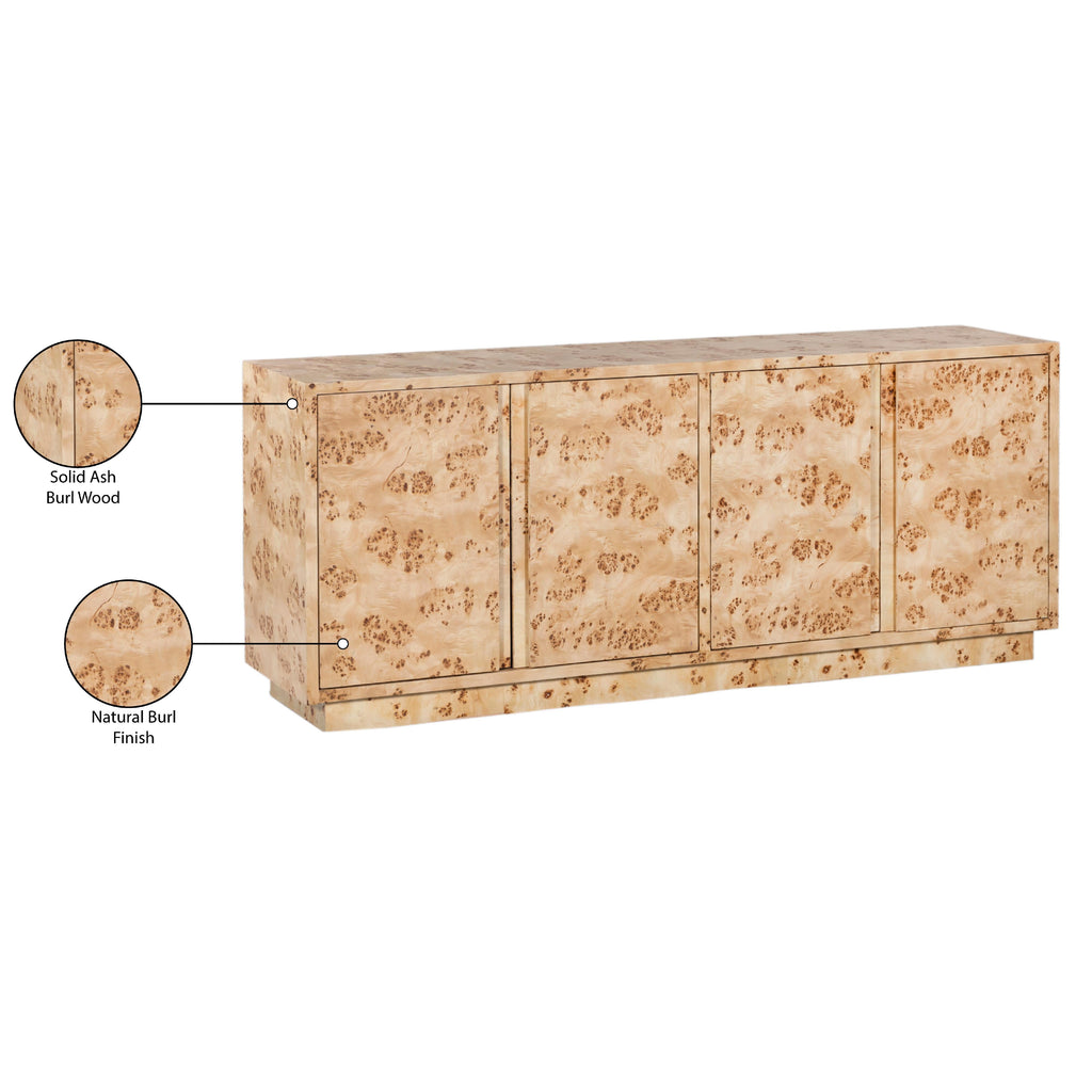 Infuse your home with timeless elegance and sophistication with the Cyrus Sideboard / Buffet. This captivating sideboard boasts a stunning natural burl finish, meticulously crafted from solid ash burl wood for both durability and visual appeal. Its mid-century modern design exudes an air of understated luxury, seamlessly blending with a variety of decor styles.