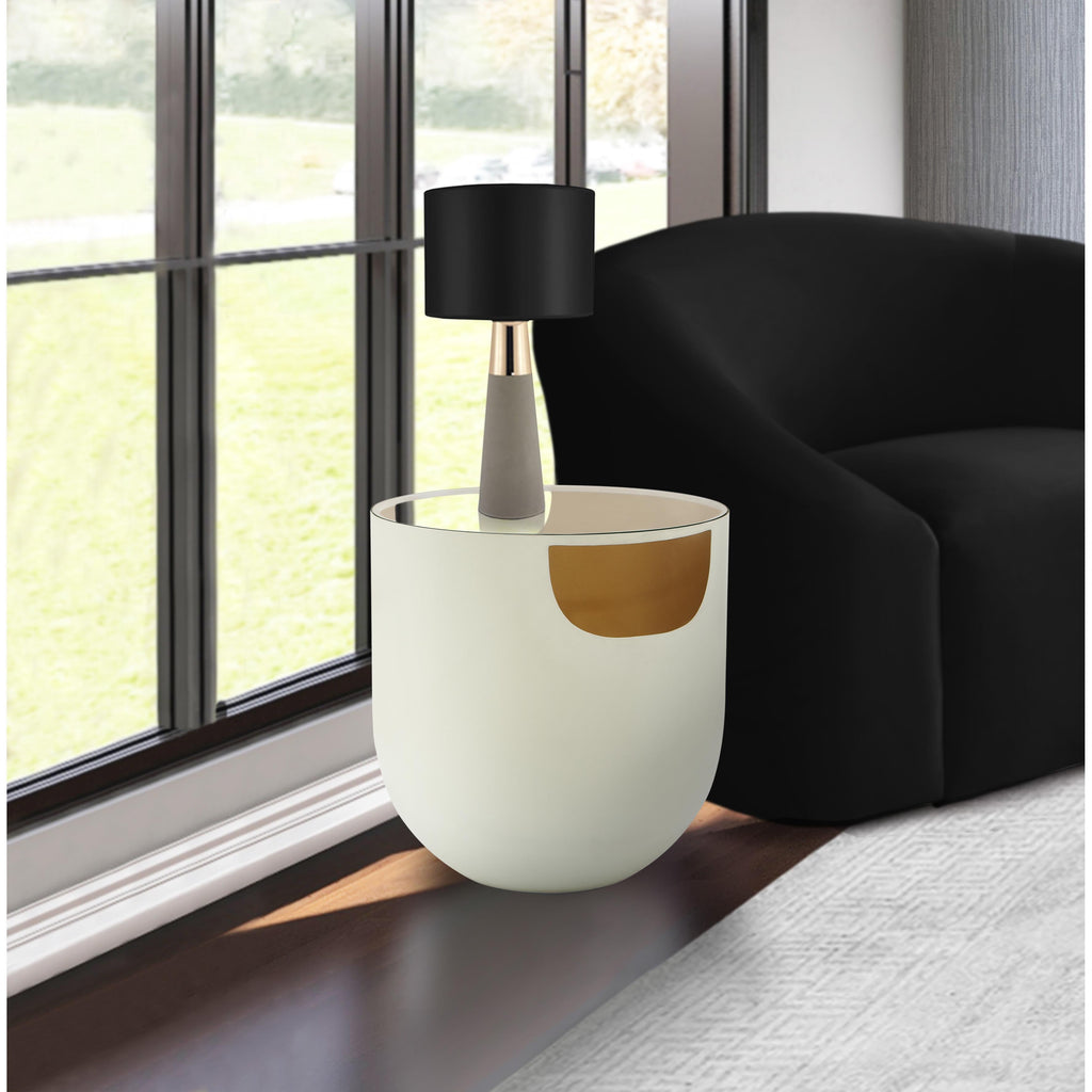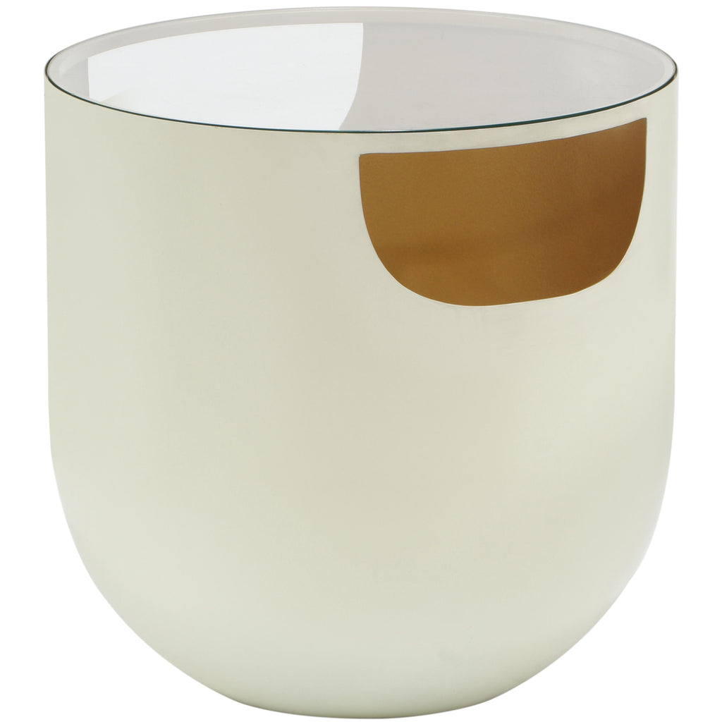Make an instant statement when you add this Doma end table to your living room or family room. Its bowl-like shape draws the eye right away, making it a focal point wherever you choose to use it. Metal construction ensures long-lived beauty and performance of this cream table while a brushed gold interior adds to its overall modern look. The glass top is sleek, beautiful, and easy to clean.