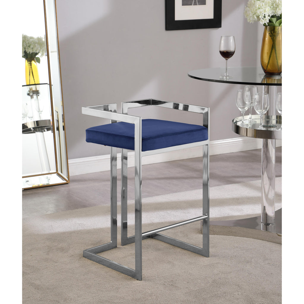 Count on the Ezra Navy Velvet Counter Stool to make a big impression in your home bar area or at the kitchen counter. The modern shape, with its clean lines and bold chrome-finished steel base give this stool a contemporary slant that's just the thing for up-to-the-minute decor settings. The seat of this stool is upholstered in rich navy velvet material for lavish comfort and a sensuous feel against the skin. The counter-height footprint ensures the stool works in a number of applications.
