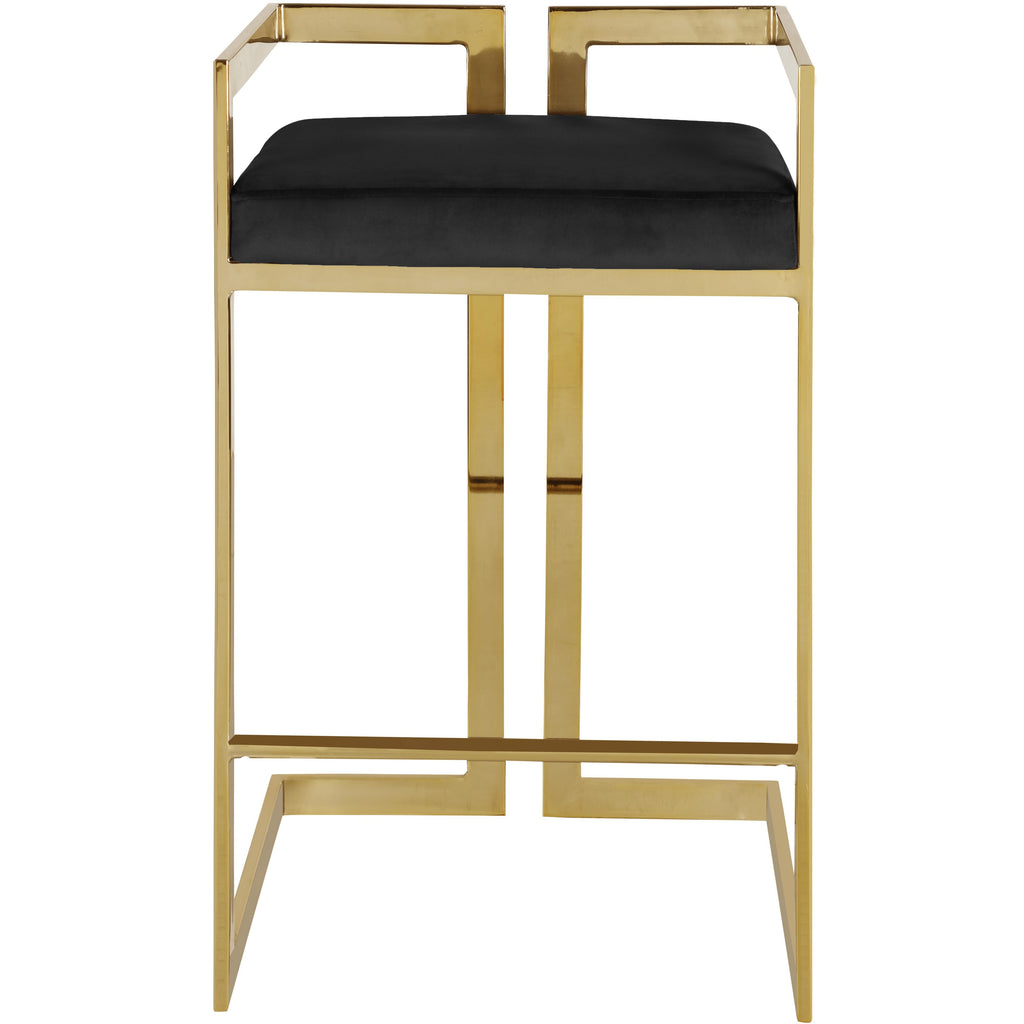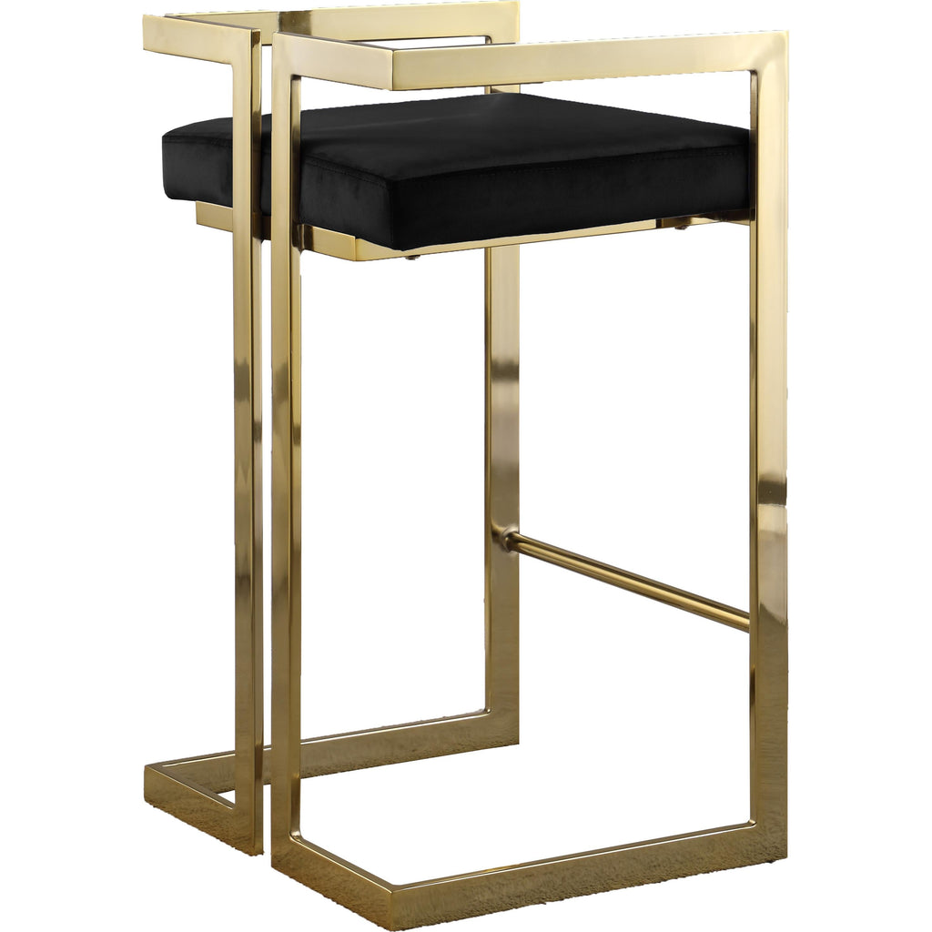 Impress guests with this Ezra Black Velvet Counter Stool. The boxy design is contemporary and uber chic, ensuring that the stool is a good fit in your modern home, whether you use it at the kitchen counter or home bar. A minimalist design makes this no-nonsense stool an unassuming addition to your space. The goldtone metal frame is robust and strong, so it can handle daily use without breaking a sweat. A plump seat cushion tops the stool and is upholstered in black velvet material for a soft, luxe feel.