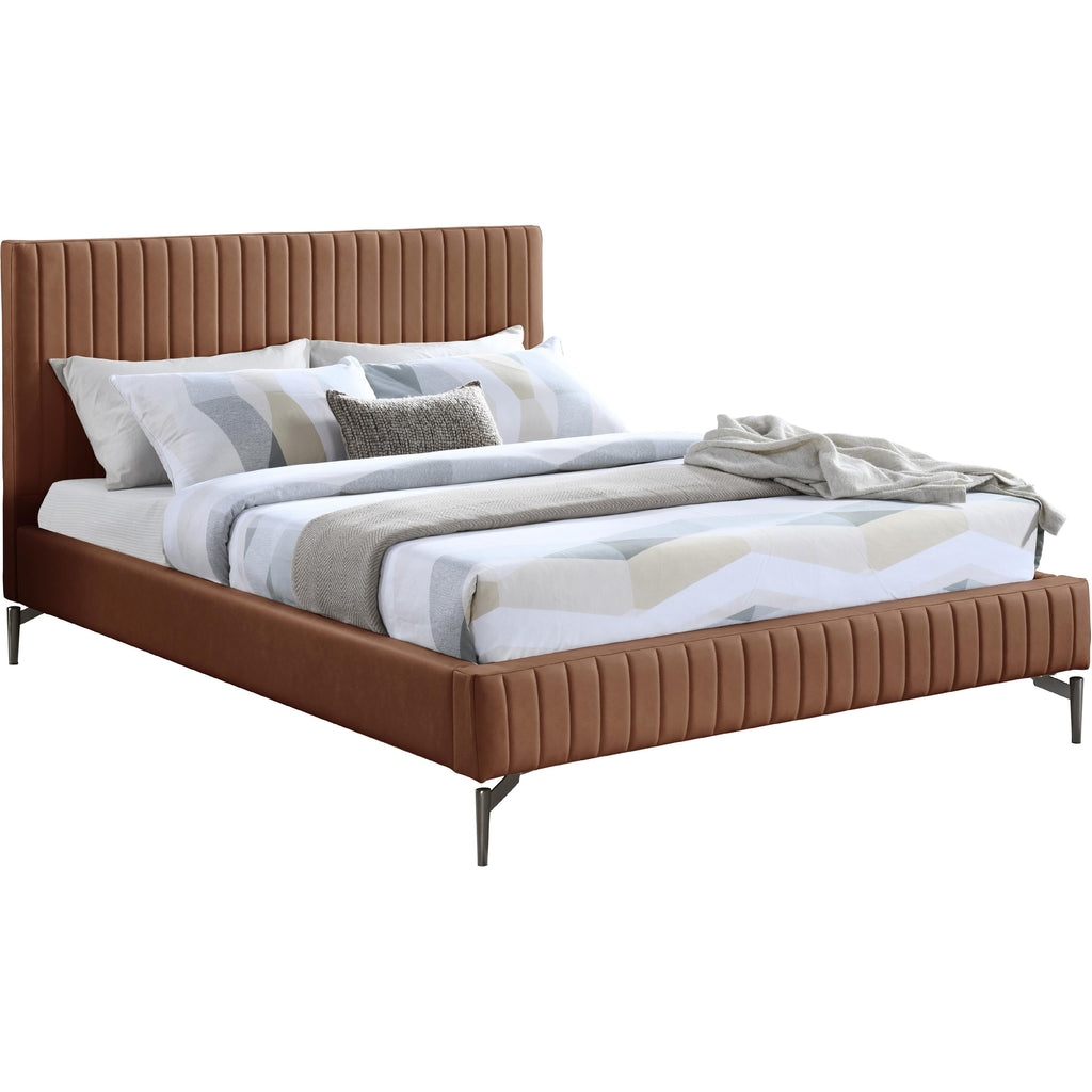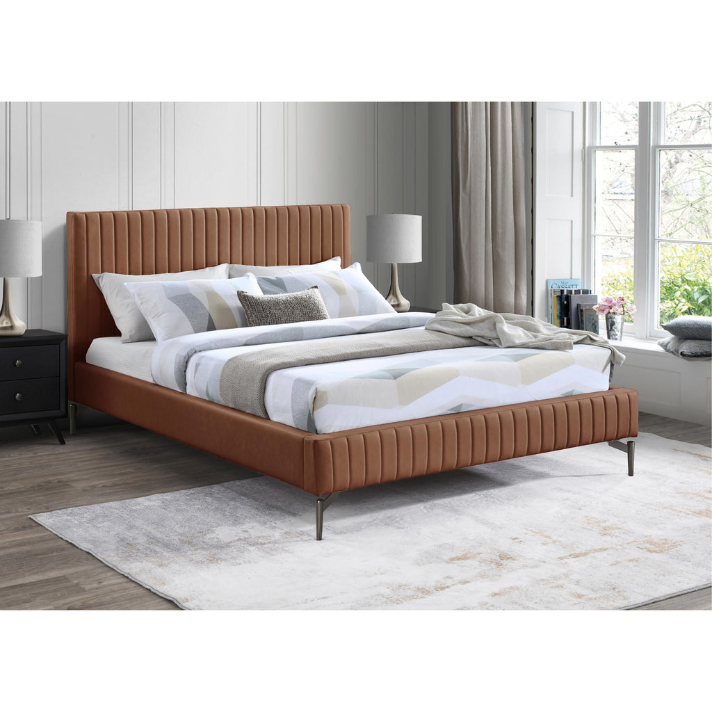 Indulge in the comfort and luxury of the Gallo Vegan Leather Full Bed, and transform your bedroom into a haven of relaxation. This exquisite piece boasts a luscious premium soft cognac vegan leather exterior that exudes elegance and sophistication. Its water-resistant and anti-scratch properties ensure durability and long-lasting beauty. The deep channel tufting adds depth and texture to the overall design, while the sleek black metal legs elevate its character and charm to new heights.