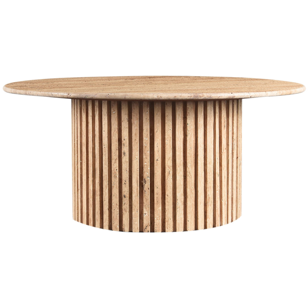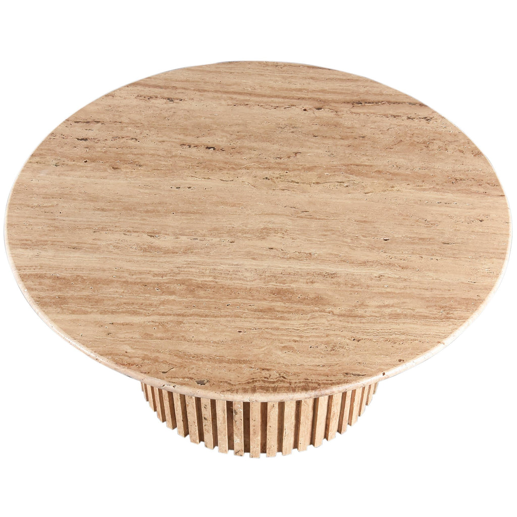 Add a refined look to your room with this handcrafted beige Genoa coffee table, a stunning masterpiece that marries elegance and practicality. Crafted from genuine travertine, each table is a unique work of art, featuring a beige travertine top with intricate white veining. The fluted travertine base adds a touch of art deco design, making it a statement piece in any room and adding to its heirloom-quality design.