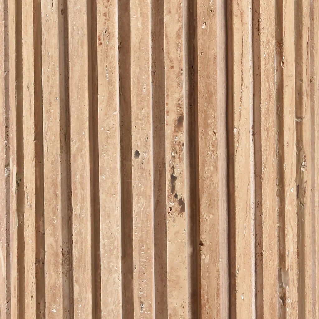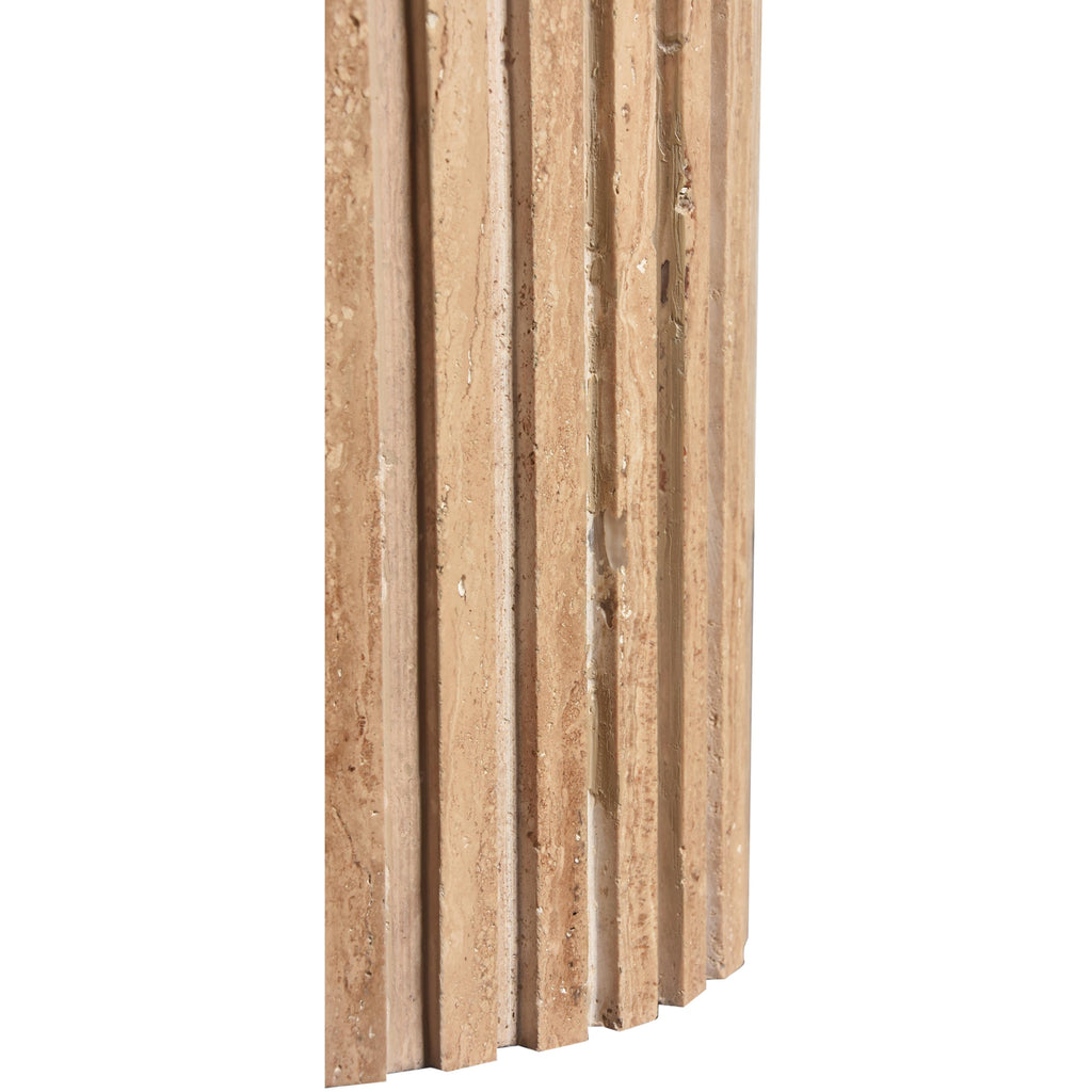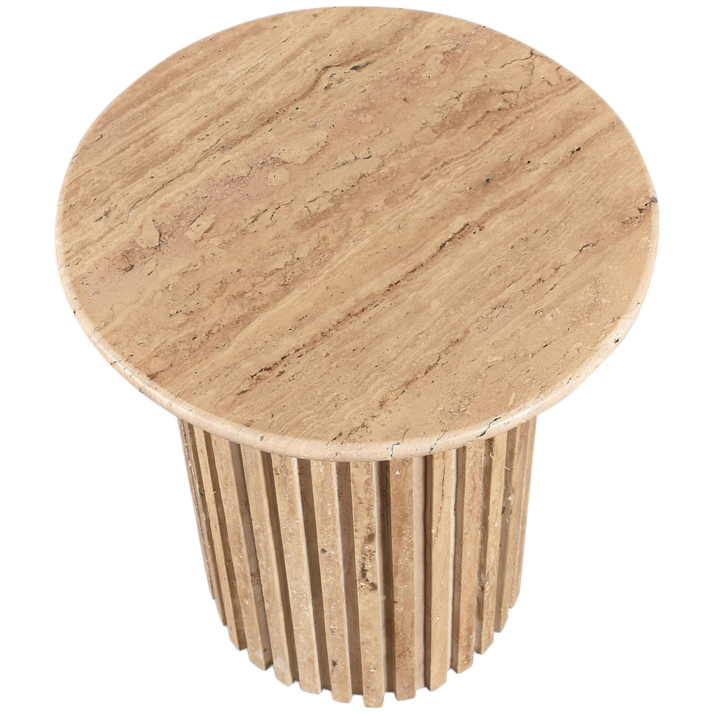 Add a refined look to your room with this handcrafted beige Genoa end table, a stunning masterpiece that marries elegance and practicality. Crafted from genuine travertine, each table is a unique work of art, featuring a beige travertine top with intricate white veining. The fluted travertine base adds a touch of art deco design, making it a statement piece in any room and adding to its heirloom-quality design.