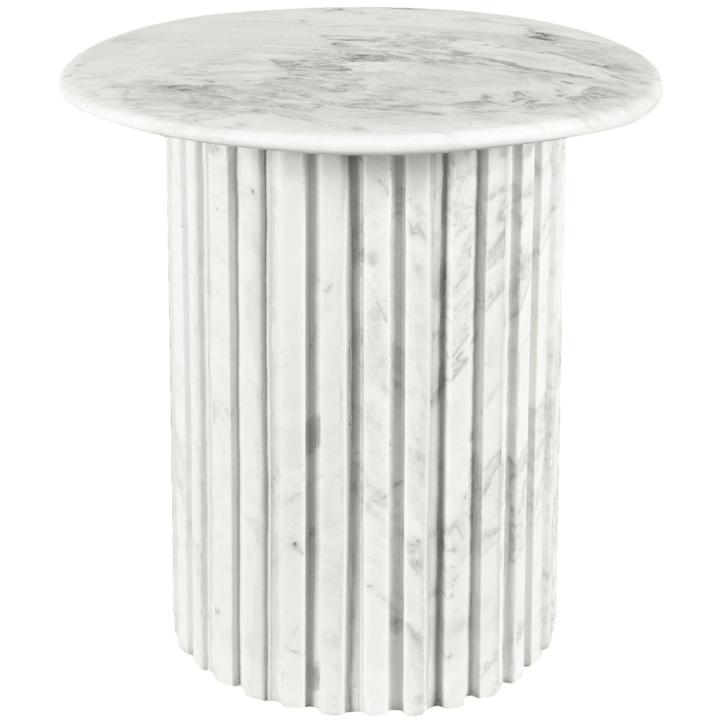 Add a refined look to your room with this handcrafted white Genoa end table, a stunning masterpiece that marries elegance and practicality. Crafted from genuine marble, each table is a unique work of art, featuring a white marble top with intricate white veining. The fluted marble base adds a touch of art deco design, making it a statement piece in any room and adding to its heirloom-quality design.