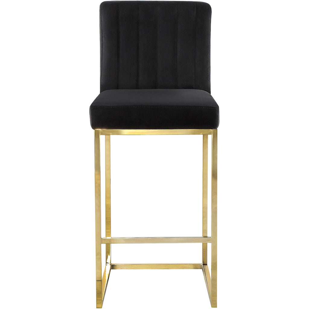 Outfit your home bar or kitchen counter with this Giselle Black Velvet Stool. The sleek black color is perfectly suited to contemporary decor and fits well with other neutral-colored furnishings for easy integration in your room, and the velvet upholstery is sleek and comforting to the touch and the skin. A gold finish on the metal frame adds to the modern panache of this stool, while a footrail along the front ensures you have a spot to rest your feet while you enjoy pancakes at the counter or a cocktail at the bar.
