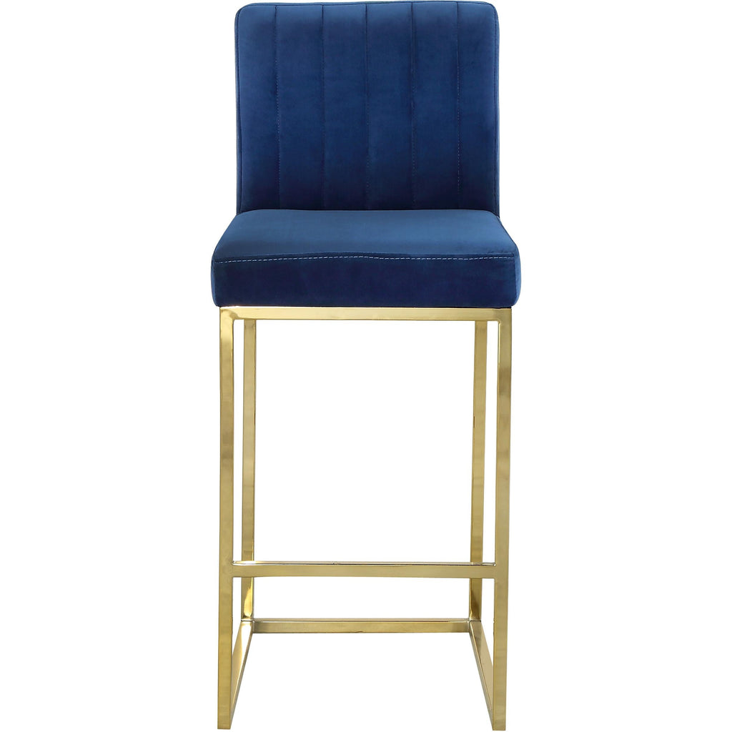 Outfit your home bar or kitchen counter with this Giselle Navy Velvet Stool. The sleek navy color is perfectly suited to contemporary decor and fits well with other neutral-colored furnishings for easy integration in your room, and the velvet upholstery is sleek and comforting to the touch and the skin. A gold finish on the metal frame adds to the modern panache of this stool, while a footrail along the front ensures you have a spot to rest your feet while you enjoy pancakes at the counter or a cocktail at the bar.