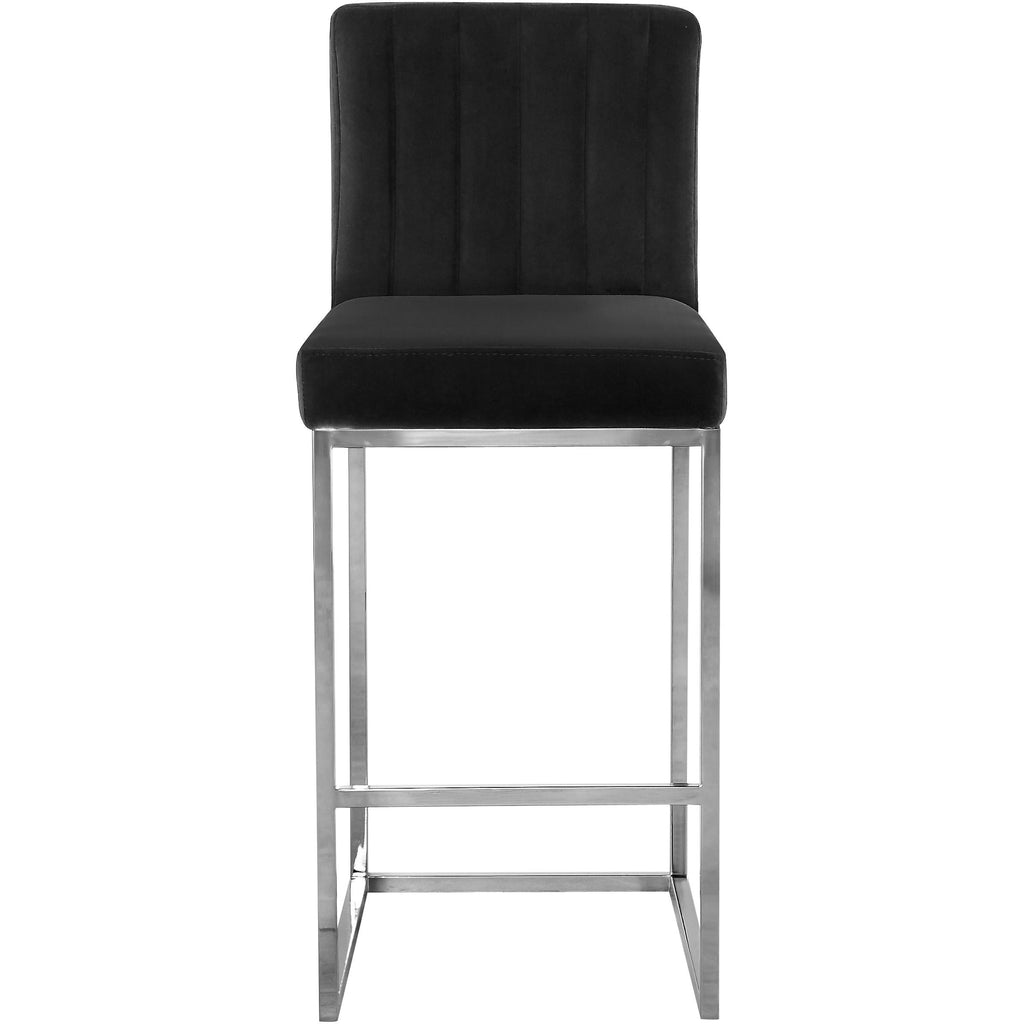 Outfit your home bar or kitchen counter with this Giselle Black Velvet Stool. The sleek black color is perfectly suited to contemporary decor and fits well with other neutral-colored furnishings for easy integration in your room, and the velvet upholstery is sleek and comforting to the touch and the skin. A chrome finish on the metal frame adds to the modern panache of this stool, while a footrail along the front ensures you have a spot to rest your feet while you enjoy pancakes at the counter or a cocktail at the bar.