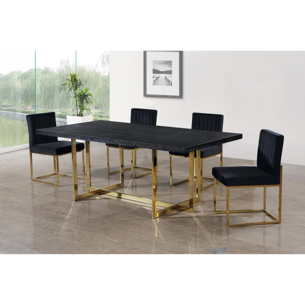 Take dining to a posh new level with this Giselle Black Velvet Dining Chair. A boxy design makes it a nice addition to contemporary spaces, and it's armless design makes it easy to get into and out of with ease. The seat and back are upholstered in rich black velvet for a lavish vibe and a pop of sumptuous color to liven up your room, and both are padded well to make sure diners stay comfy while they enjoy their meal. The metal frame is finished in gold for added beauty and aesthetic appeal.