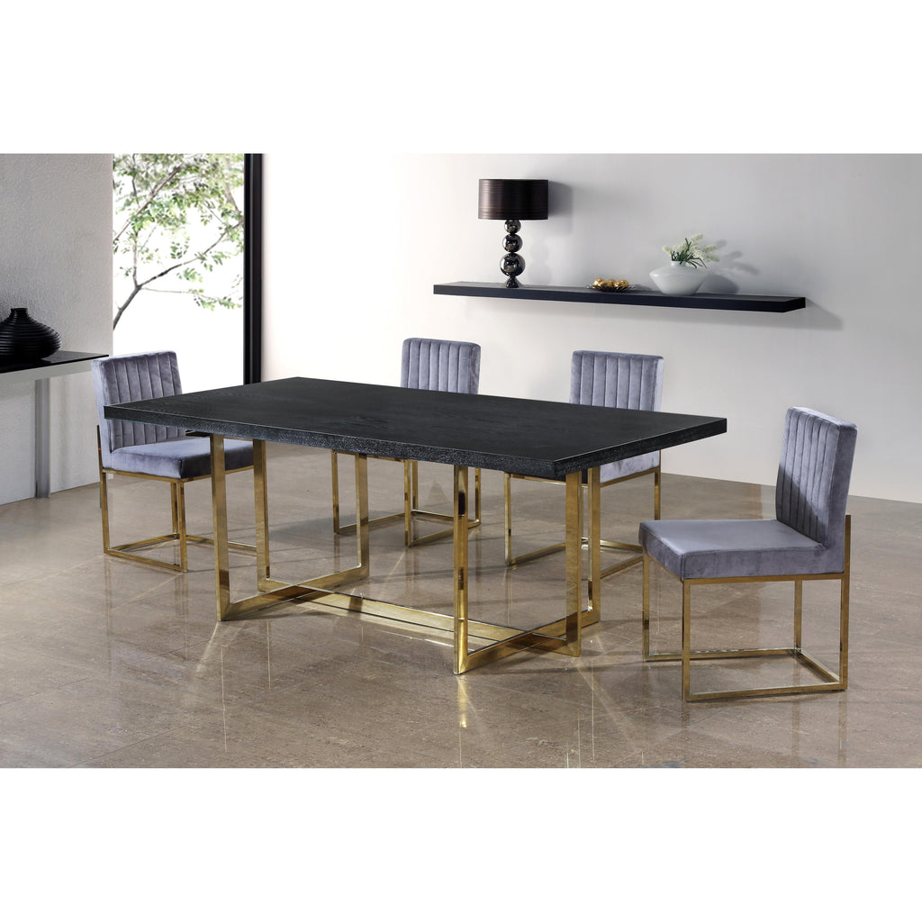 Take dining to a posh new level with this Giselle Grey Velvet Dining Chair. A boxy design makes it a nice addition to contemporary spaces, and it's armless design makes it easy to get into and out of with ease. The seat and back are upholstered in rich grey velvet for a lavish vibe and a pop of sumptuous color to liven up your room, and both are padded well to make sure diners stay comfy while they enjoy their meal. The metal frame is finished in gold for added beauty and aesthetic appeal.
