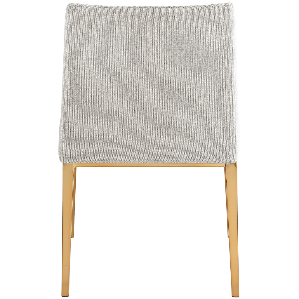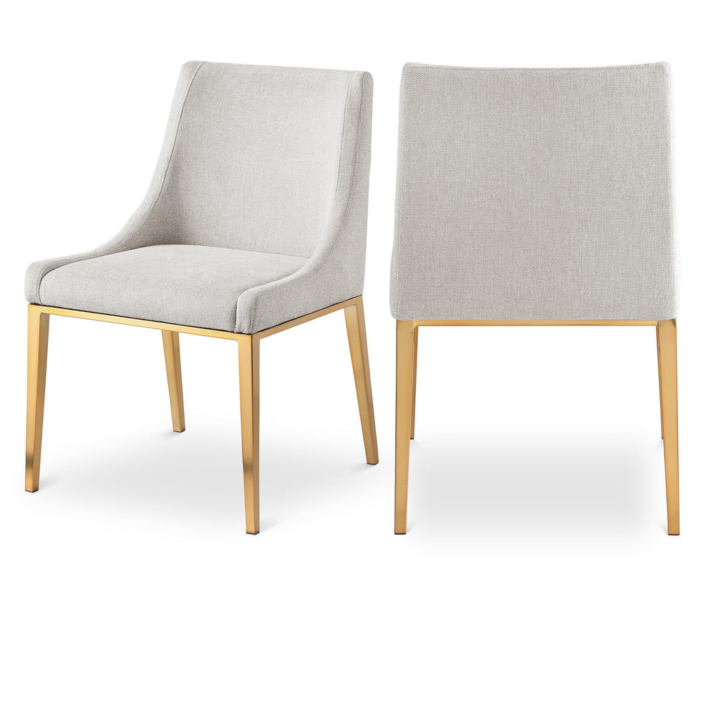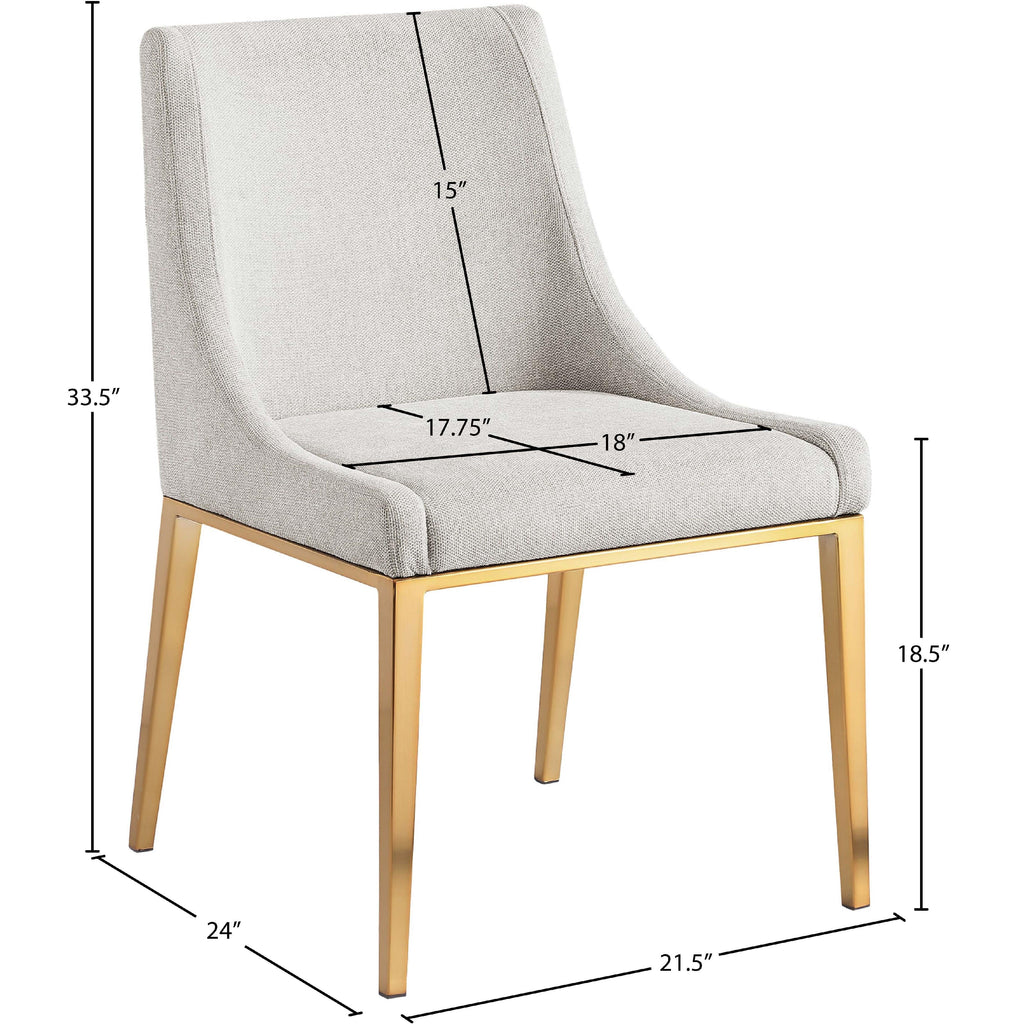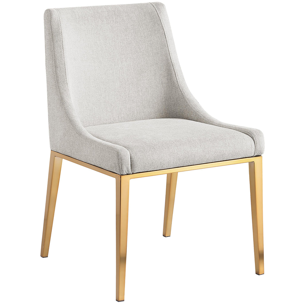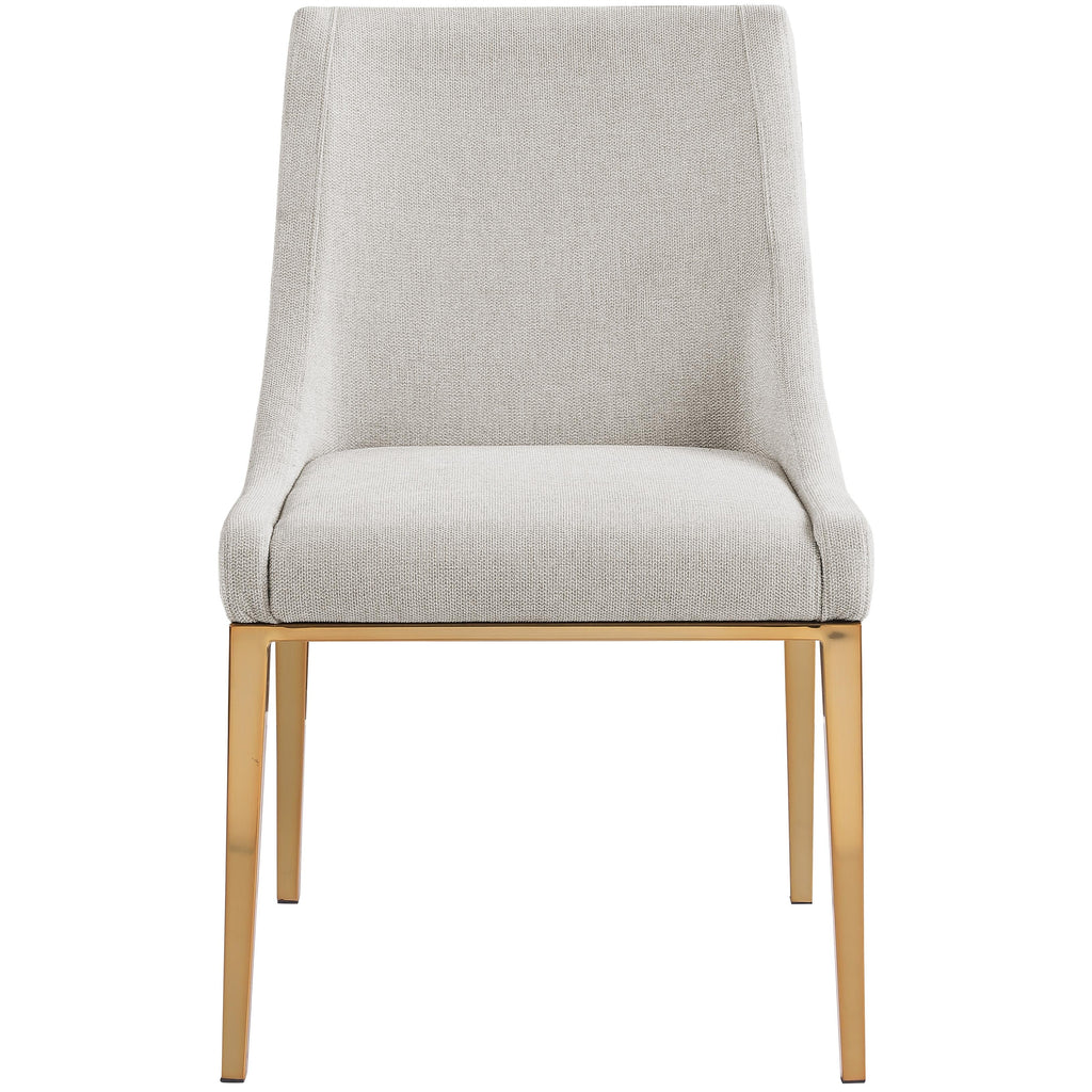 Give your dining room a touch of contemporary charm with this Haines polyester fabric dining chair. Exuding beautiful refinement and elegance from all angles, this chair gives your dining room an instant makeover. Soft beige polyester fabric covers every square inch of the back and seat, giving the chair a luxurious feel against the skin while making maintenance a breeze. Brushed gold legs on the chairs' metal frames add an elegant finish to the design.