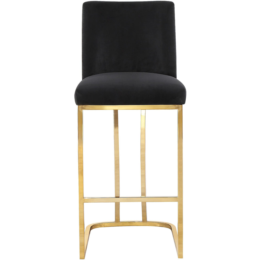 Make sure guests stay comfortable as they wine and dine from this Heidi Black Velvet Stool. This stool has a sleek metal base finished in gold for a chic look and is upholstered in sumptuous black velvet for a touch of glam. The upholstery is top quality and has a sleek, velvety feel against the skin for a refined and elegant presentation. The armless design facilitates conversation, and a footrail on the bottom gives you a spot to rest your feet while you dine.
