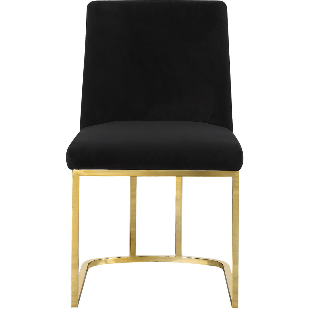 Lend your dining room a Hollywood-inspired vibe with this chic Heidi Black Velvet Dining Chair. This pretty chair features velvety smooth upholstery on its back and seat cushions to comfort and pamper guests while they enjoy their meals. The black velvet and gold metal combination ensures that you make a big statement in your space. The metal frame has a polished gold finish that adds to the lavish look of this armless chair.