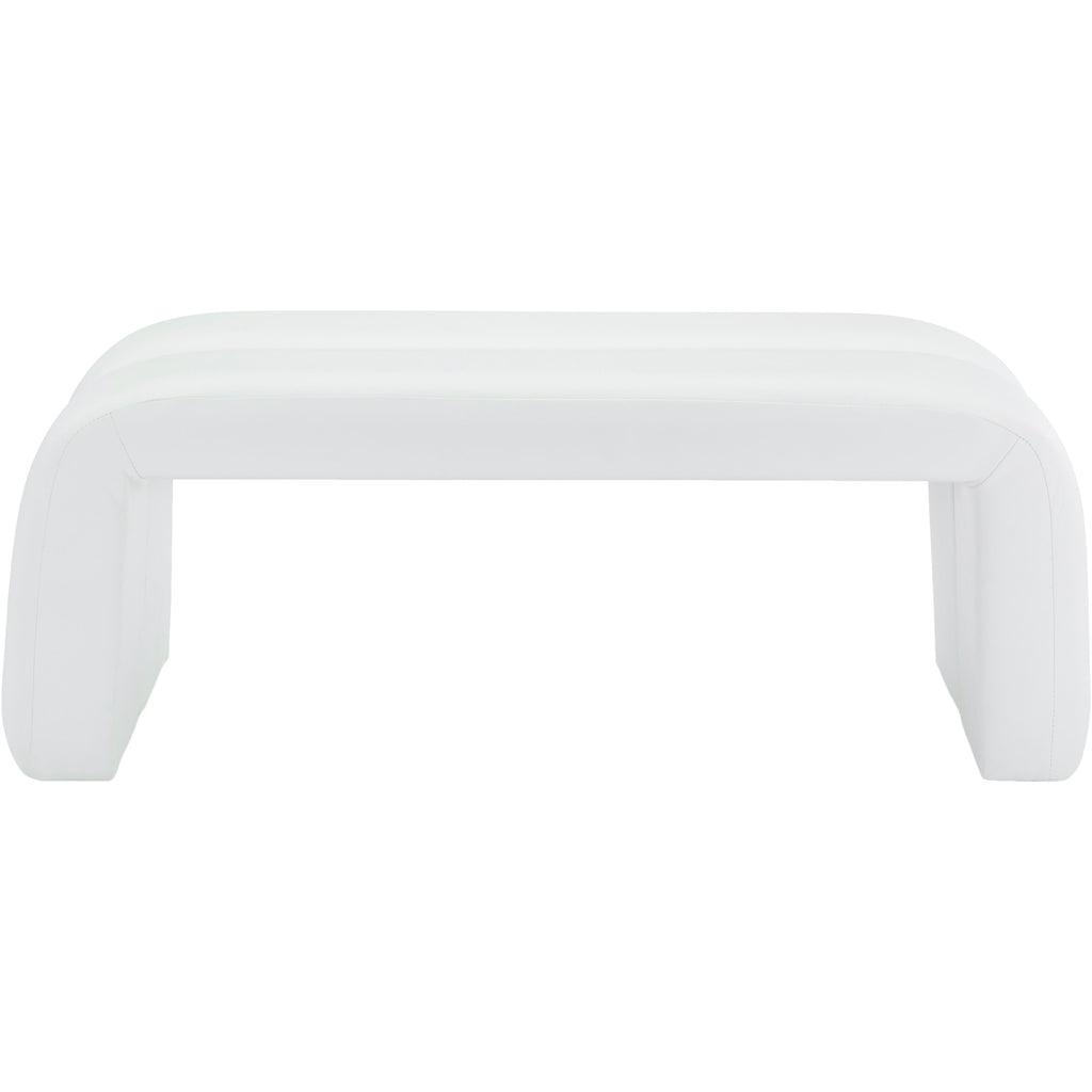 Add impromptu seating in the bedroom, foyer, or beyond with his lovely white vegan leather bench. This handsome bench has unexpected curves and lines that make it a true work of art in any setting. The soft vegan leather combined with deep channel tufting make it comfortable for sitting while pulling on boots or taking off shoes in the entryway. Position it at the foot of the bed for holding blankets or other items within easy reach.