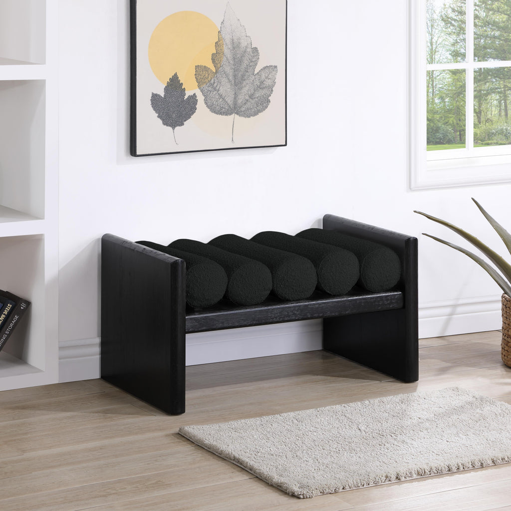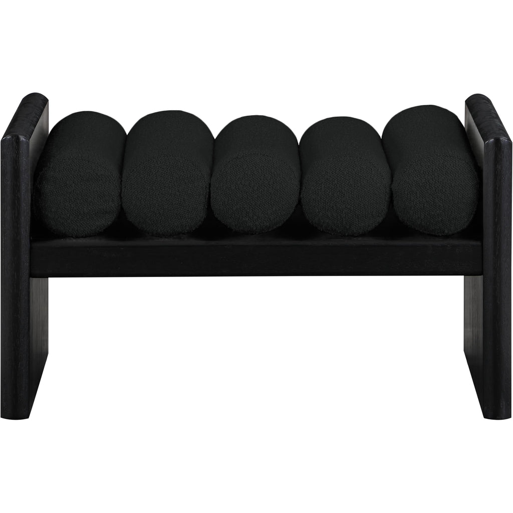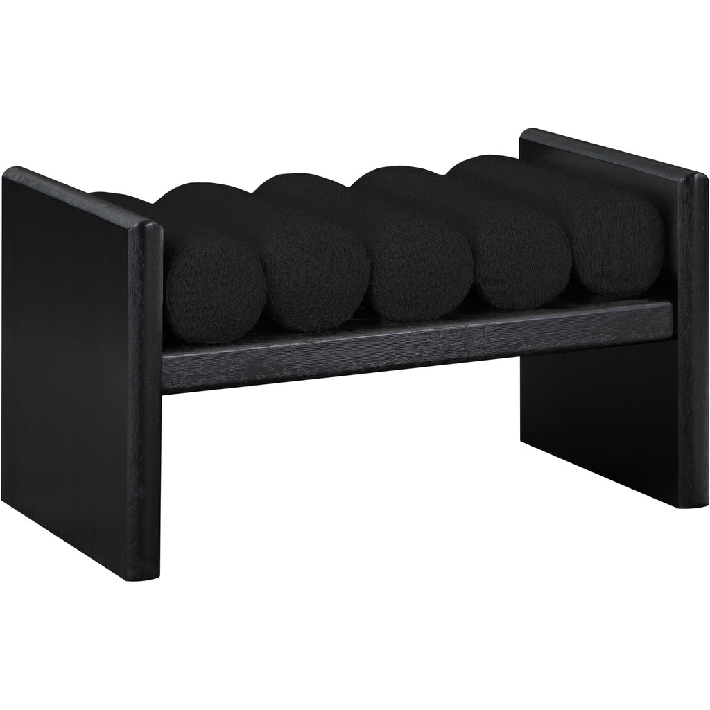 Add originality to your home with this unique bench from Meridian Furniture's Waverly collection. Crafted using solid rubber wood with black finish, this bench makes a bold statement in any living space. Its H-shaped design holds five rich black boucle fabric cushion rolls on top, providing a comfortable place to sit for you or your guests. It's big enough to seat more than one person, providing you with extra seating space, and its contemporary design is perfect for any modern home.