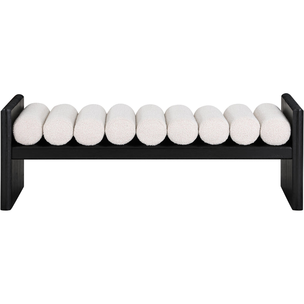 Add originality to your home with this unique bench from Meridian Furniture's Waverly collection. Crafted using solid rubber wood with a black finish, this bench makes a bold statement in any living space. Its H-shaped design holds nine rich green boucle fabric cushion rolls on top, providing a comfortable place to sit for you or your guests. It's big enough to seat more than one person, providing you with extra seating space, and its contemporary design is perfect for any modern home.