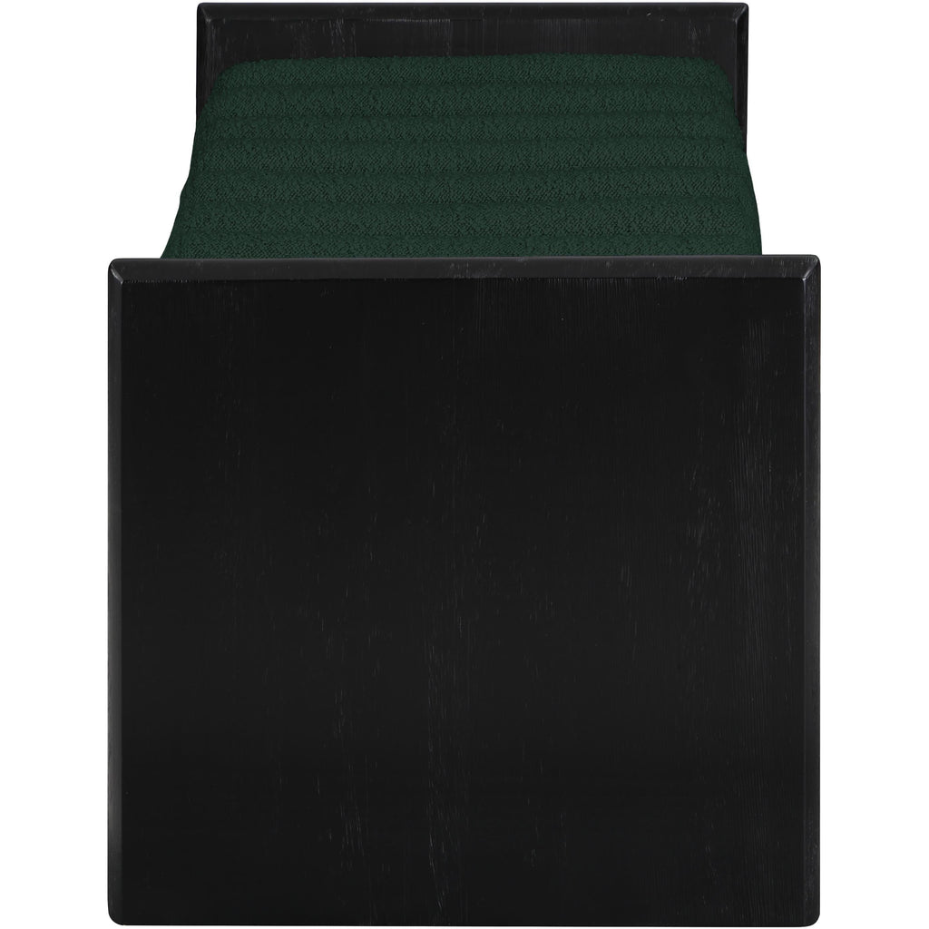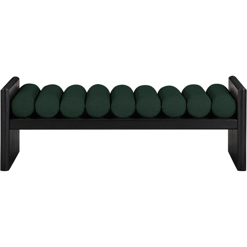 Add originality to your home with this unique bench from Meridian Furniture's Waverly collection. Crafted using solid rubber wood with a black finish, this bench makes a bold statement in any living space. Its H-shaped design holds nine rich green boucle fabric cushion rolls on top, providing a comfortable place to sit for you or your guests. It's big enough to seat more than one person, providing you with extra seating space, and its contemporary design is perfect for any modern home.