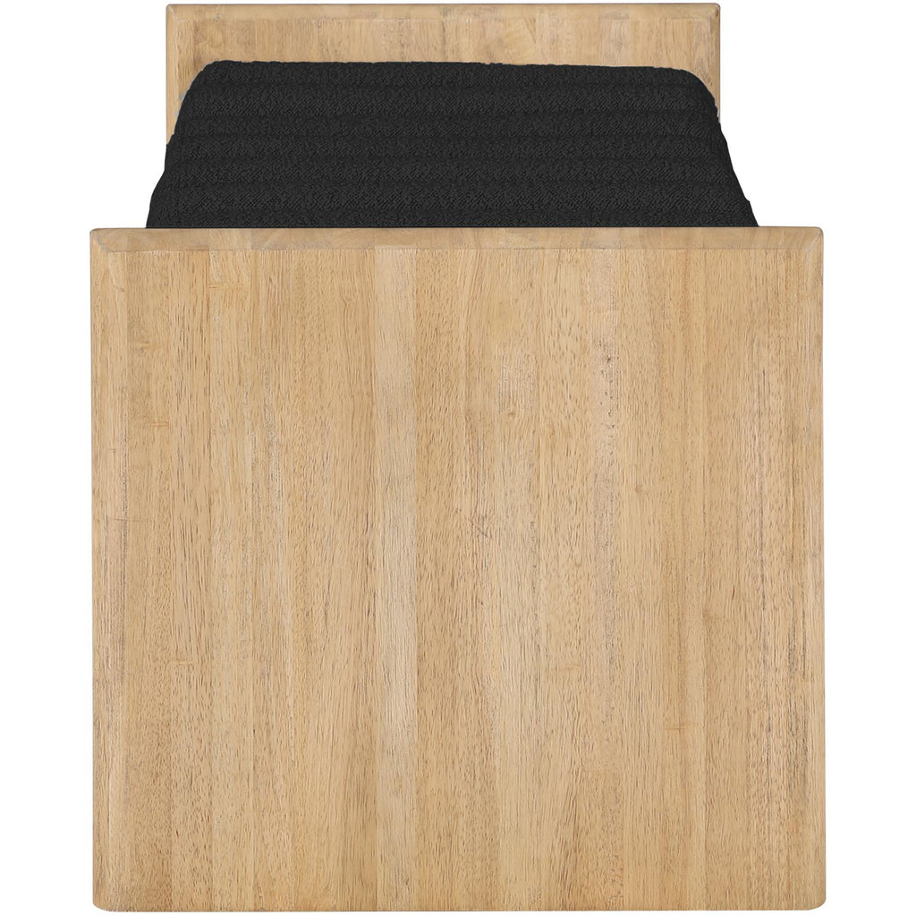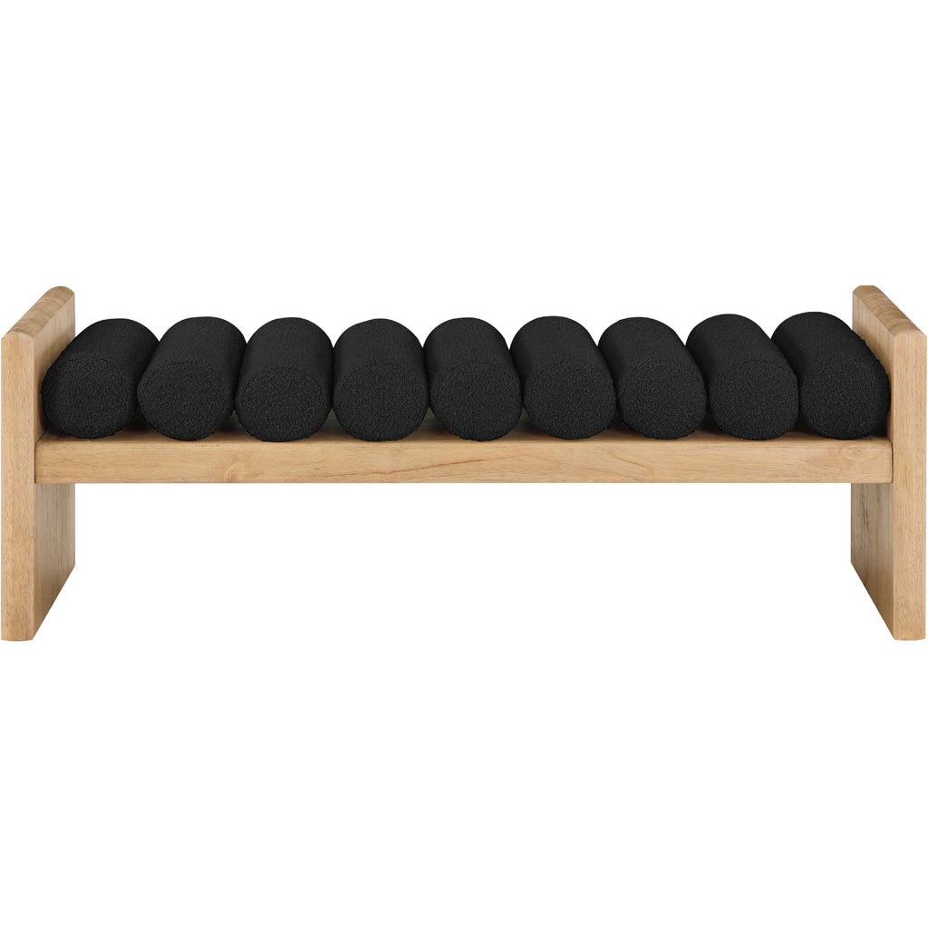 Add originality to your home with this unique bench from Meridian Furniture's Waverly collection. Crafted using solid rubber wood with a natural finish, this bench makes a bold statement in any living space. Its H-shaped design holds nine rich black boucle fabric cushion rolls on top, providing a comfortable place to sit for you or your guests. It's big enough to seat more than one person, providing you with extra seating space, and its contemporary design is perfect for any modern home.