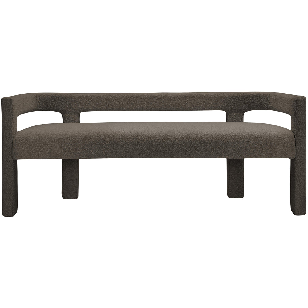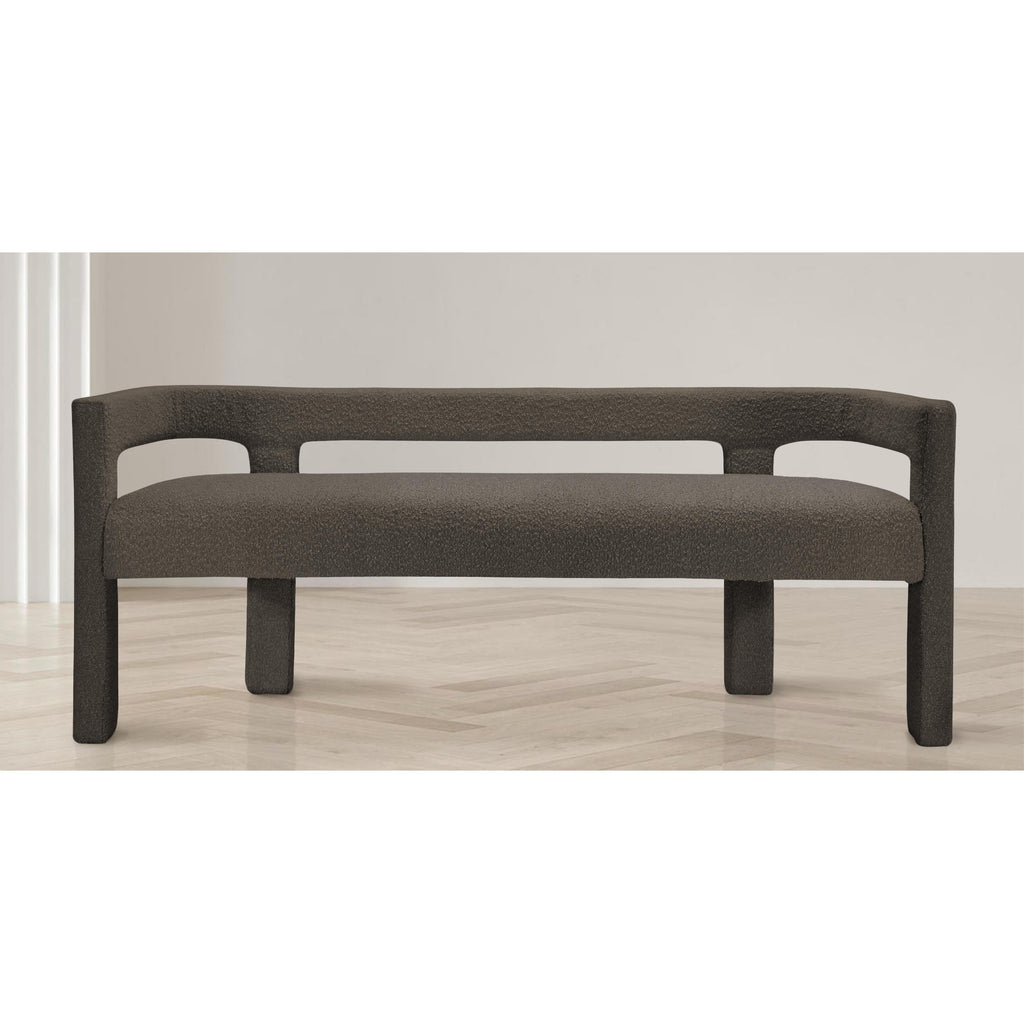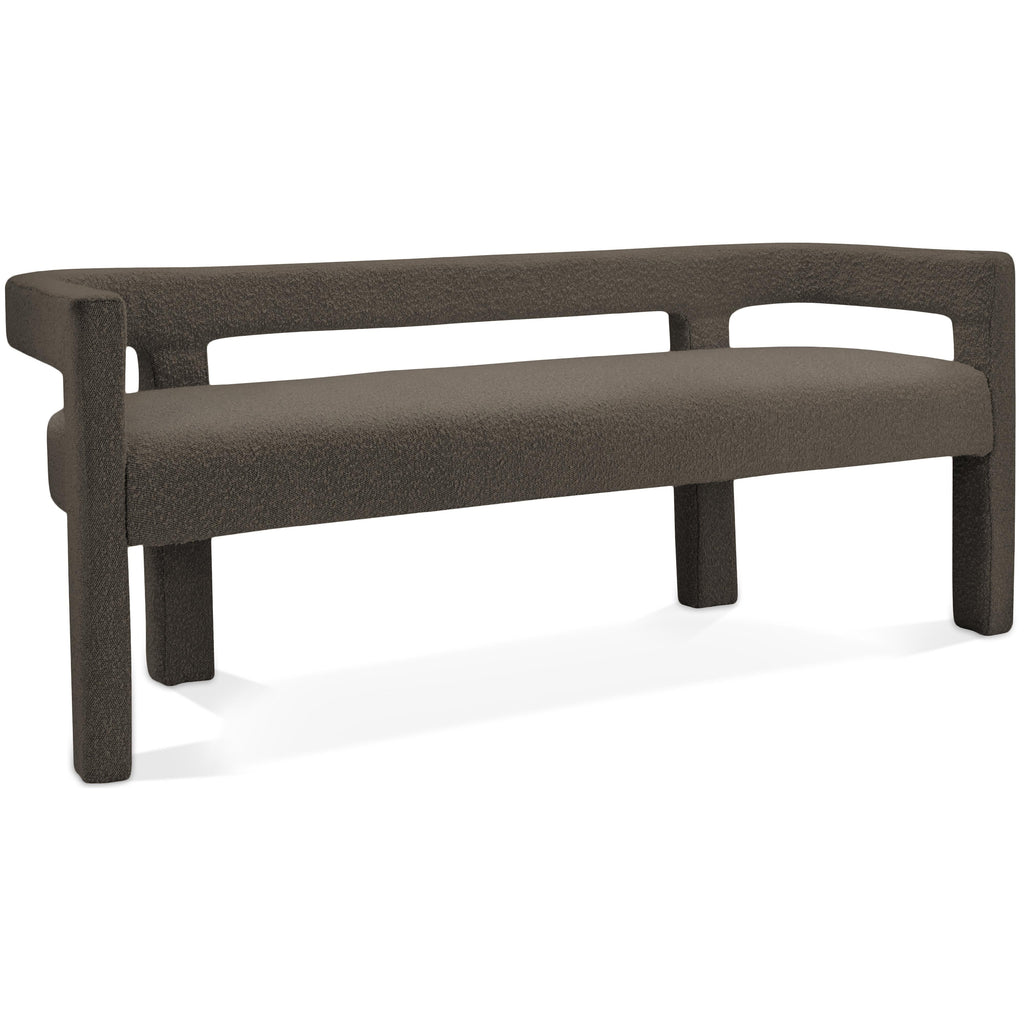 Get comfortable with this Athena bench featuring minimalistic design elements and a simple footprint. Artfully designed, this bench is made for comfort with a rounded footprint that hugs your back while you sit and relax with friends. The bench is covered top to bottom in rich brown boucle fabric, so it's super soft to the touch and elegant to the eye.