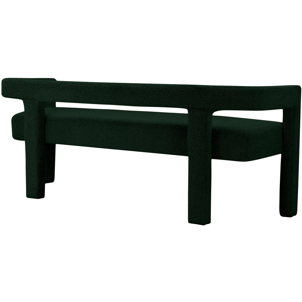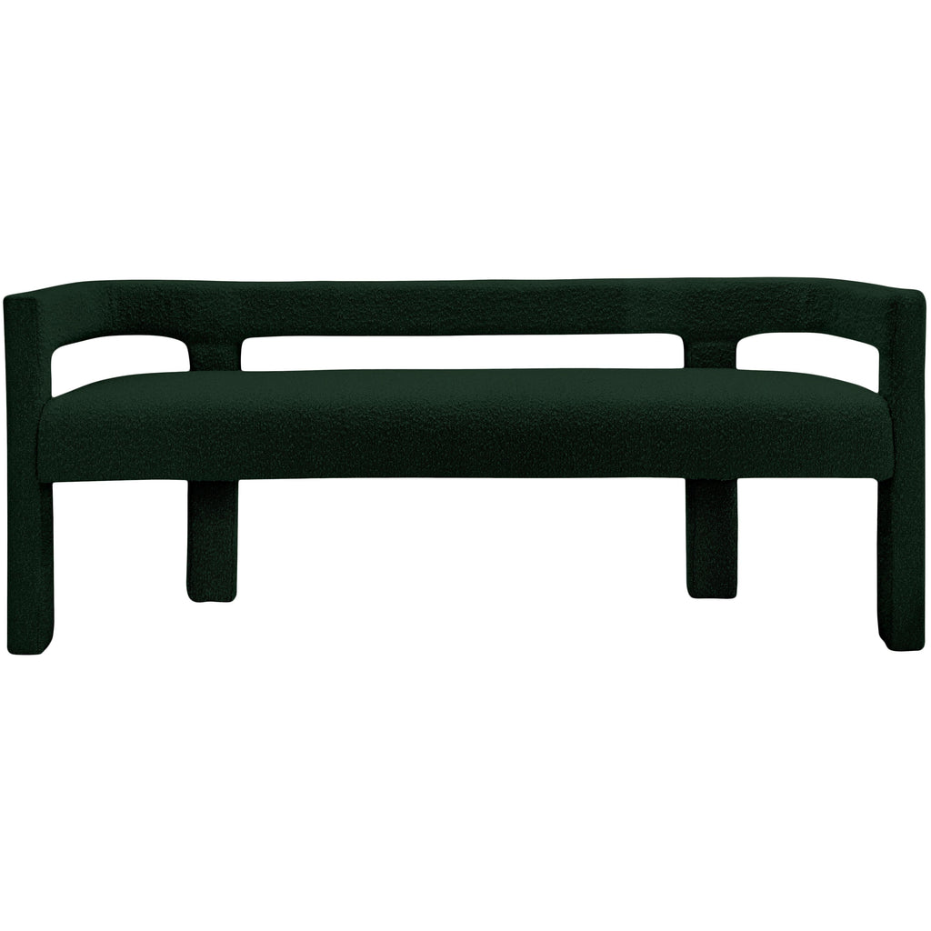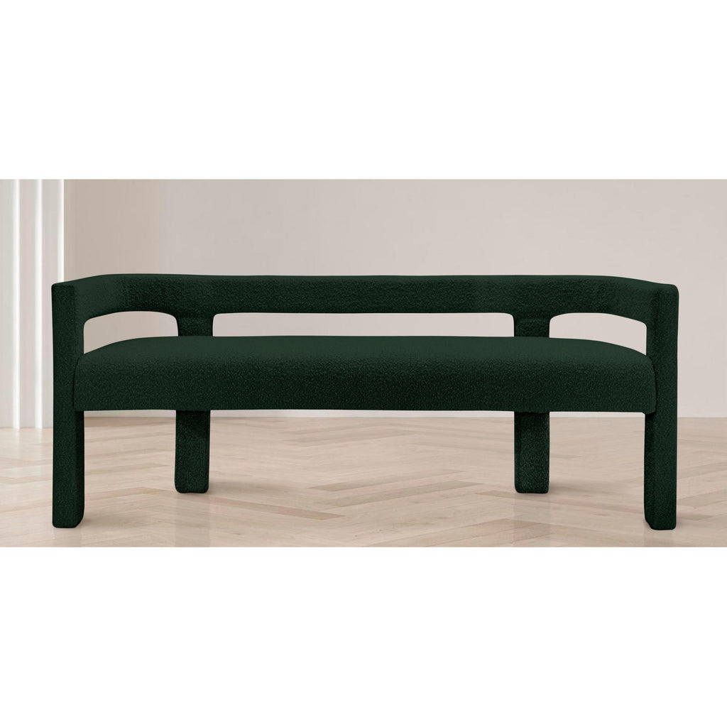 Get comfortable with this Athena bench featuring minimalistic design elements and a simple footprint. Artfully designed, this bench is made for comfort with a rounded footprint that hugs your back while you sit and relax with friends. The bench is covered top to bottom in rich green boucle fabric, so it's super soft to the touch and elegant to the eye.
