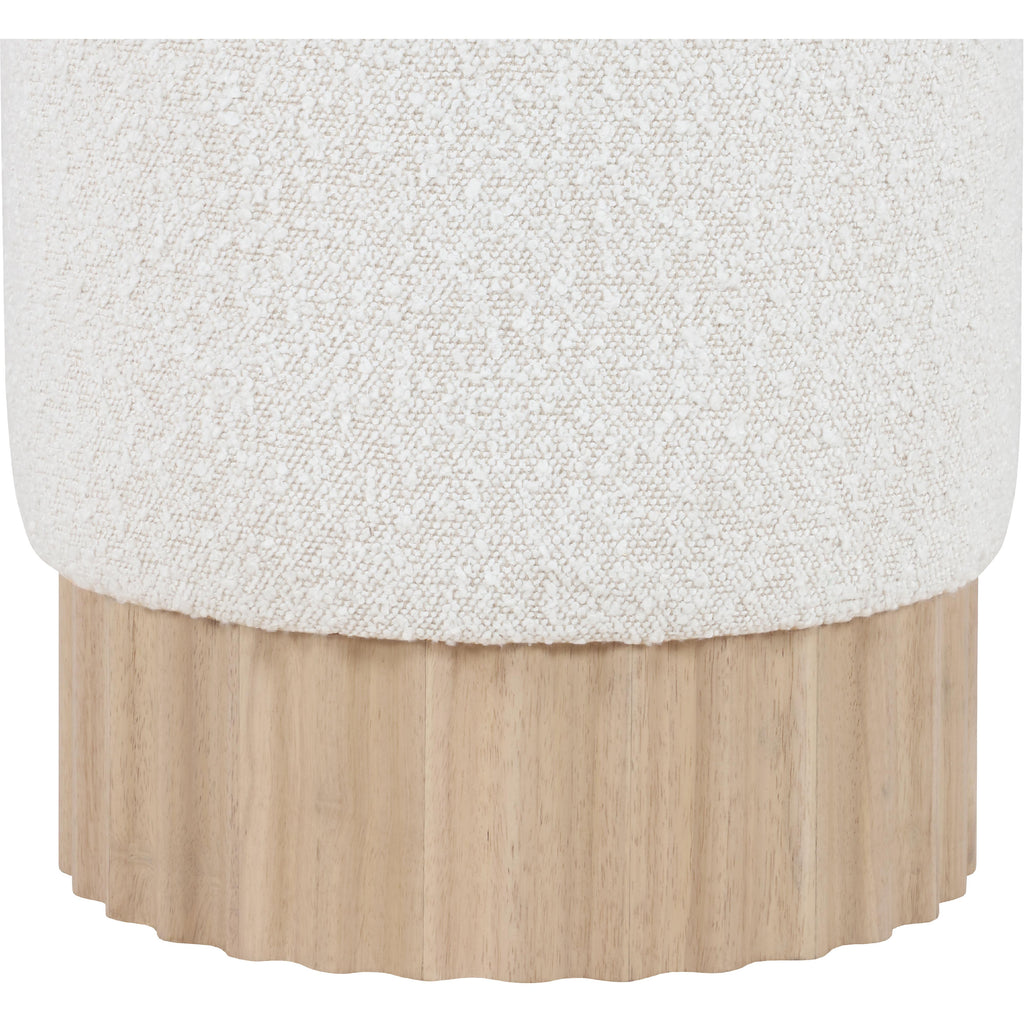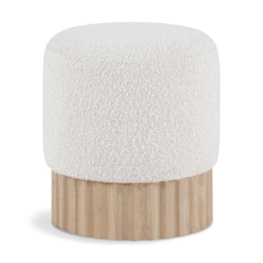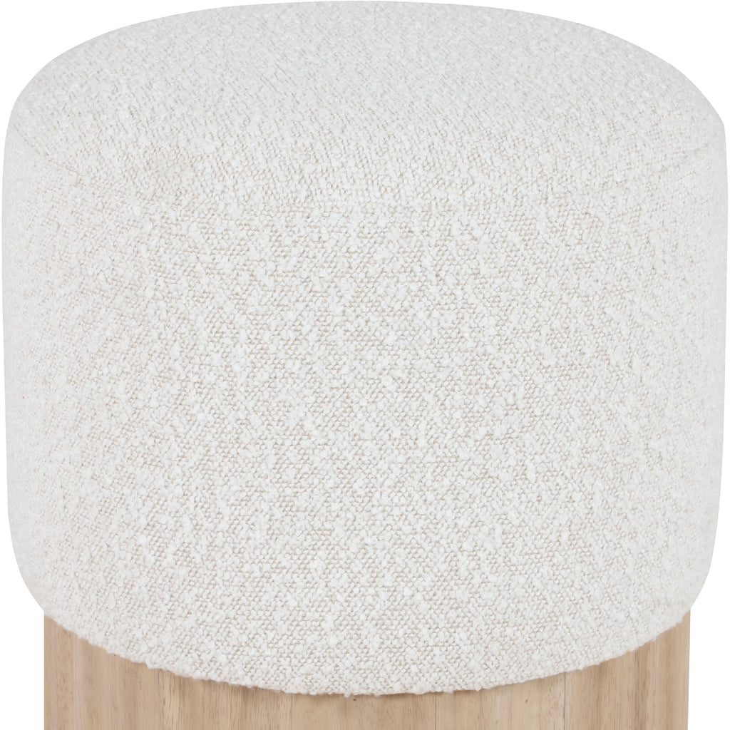 Indulge in the luxurious texture of the Veranda Boucle Fabric Ottoman/Stool. It boasts a rich cream boucle fabric that is paired with an elegant and sturdy solid wood base, featuring a natural finish that highlights the beautiful wood grain patterns. This unique combination of materials creates a perfect blend of style and durability, making it an ideal addition to any modern or traditional interior design.
