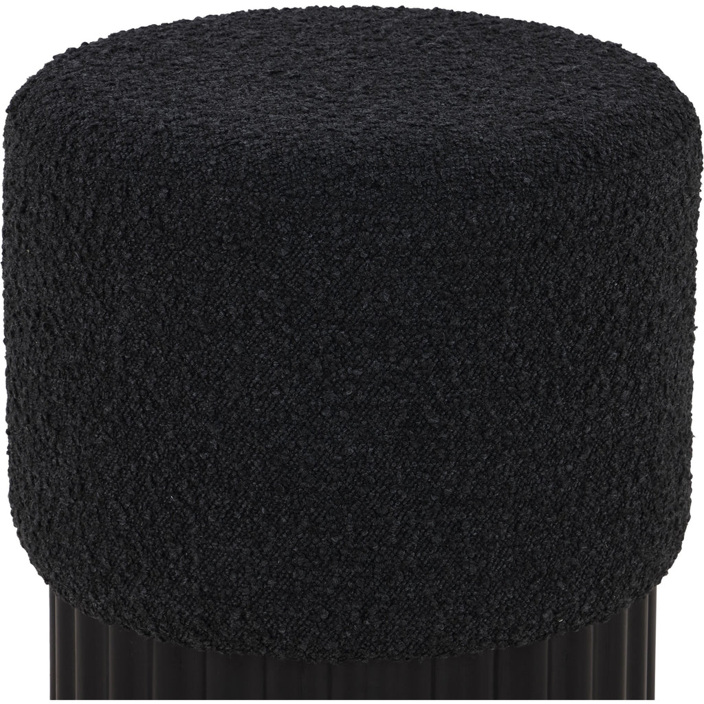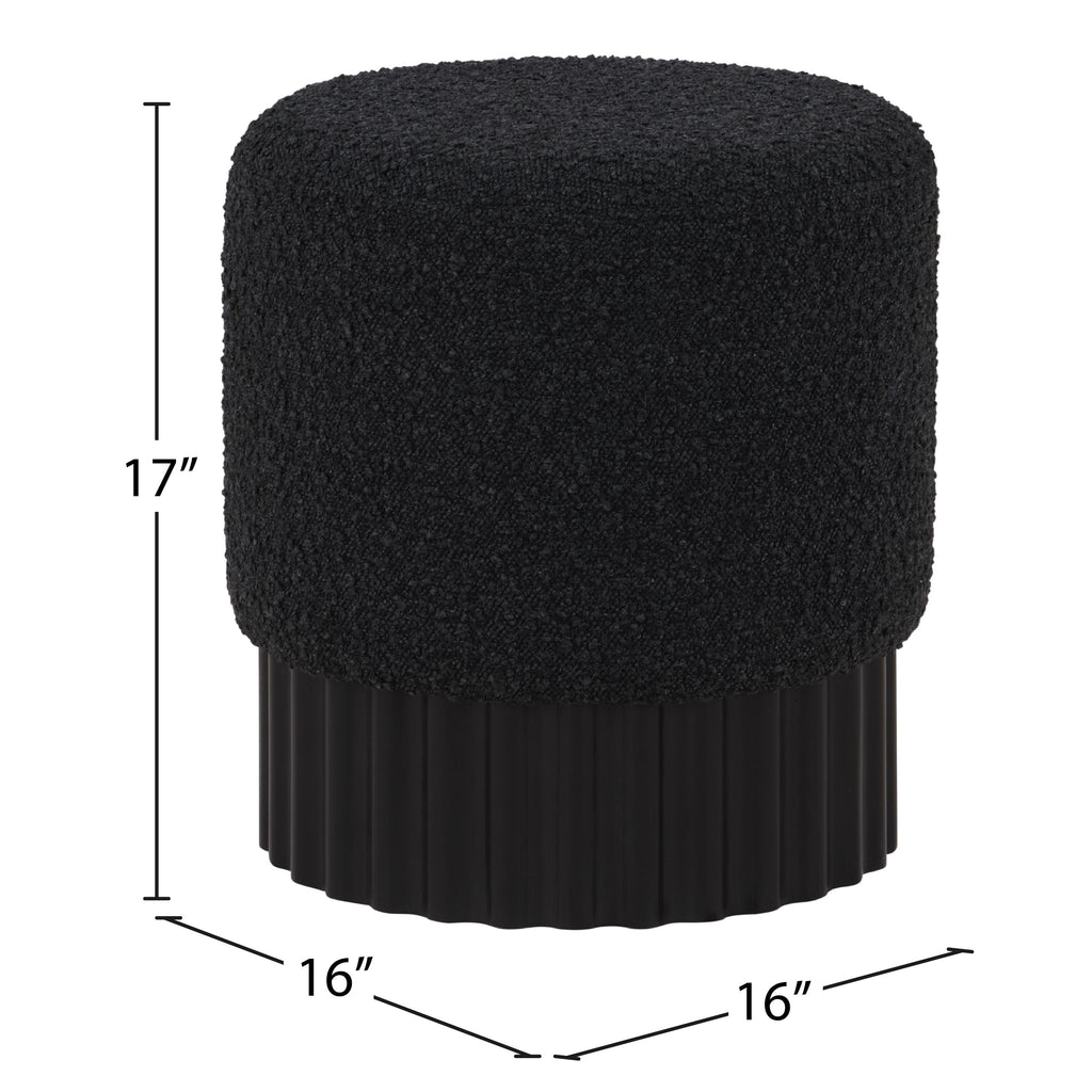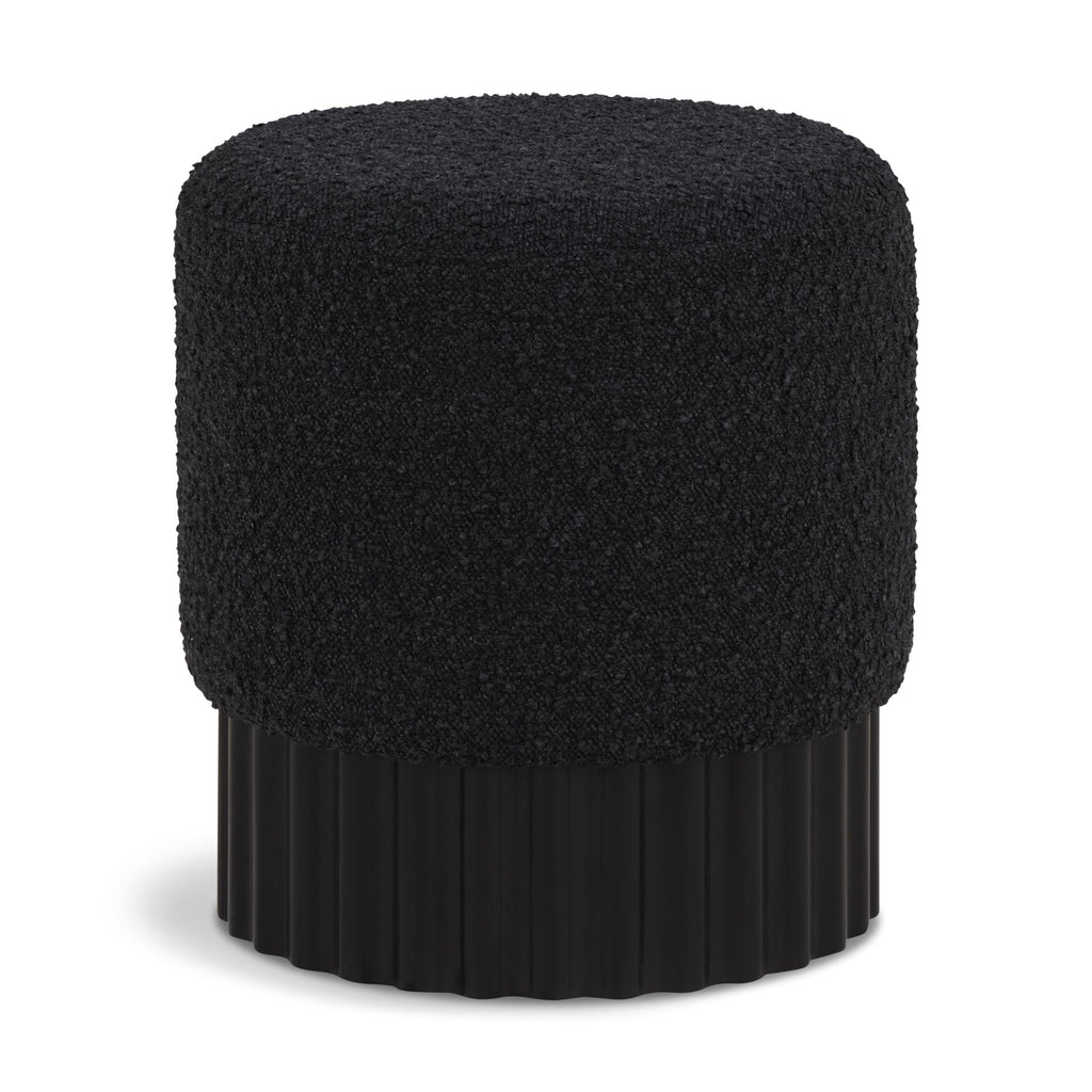 Indulge in the luxurious texture of the Veranda Boucle Fabric Ottoman/Stool. It boasts a rich black boucle fabric that is paired with an elegant and sturdy solid wood base, featuring a black finish that highlights the beautiful wood grain patterns. This unique combination of materials creates a perfect blend of style and durability, making it an ideal addition to any modern or traditional interior design.