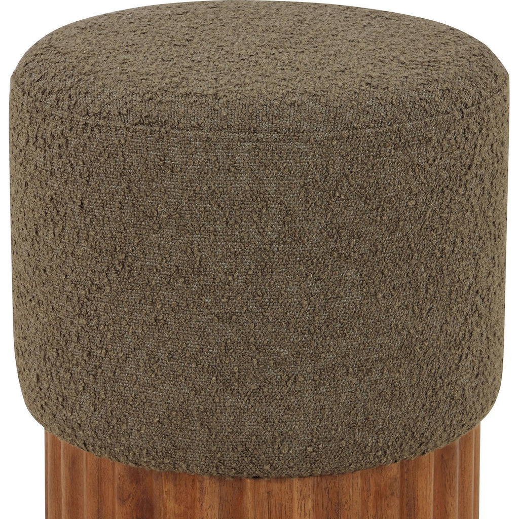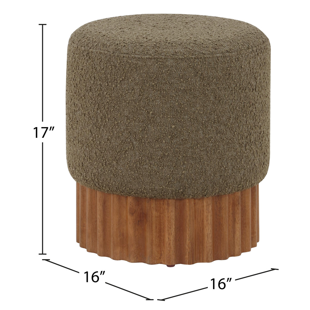 Indulge in the luxurious texture of the Veranda Boucle Fabric Ottoman/Stool. It boasts a rich olive boucle fabric that is paired with an elegant and sturdy solid wood base, featuring a walnut finish that highlights the beautiful wood grain patterns. This unique combination of materials creates a perfect blend of style and durability, making it an ideal addition to any modern or traditional interior design.