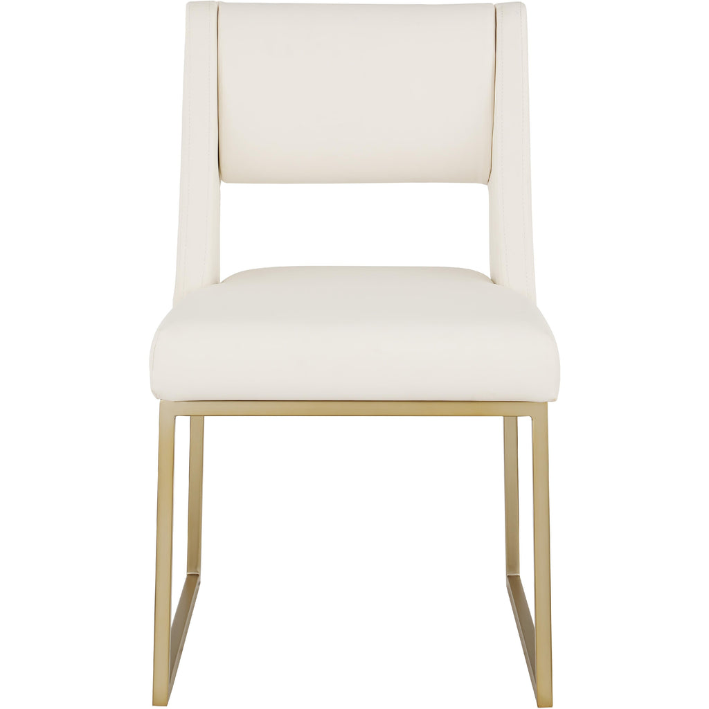 Get comfy at your dinner table with this Jayce cream vegan leather dining chair. Its soft cream vegan leather upholstery offers a comfortable place to sit, while its brushed brass iron base provides stability and durability. Its semi-open back, contemporary design is ideal for any modern home decor, while also providing you with upper back support while you enjoy your meal. A foam cushion ensures additional comfort while you sit, so you can enjoy meals on a whole new level.