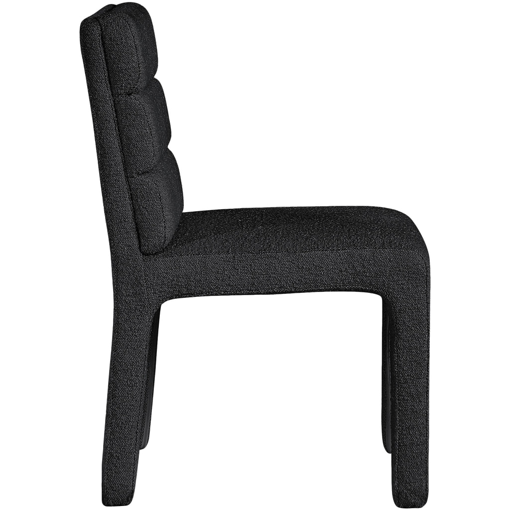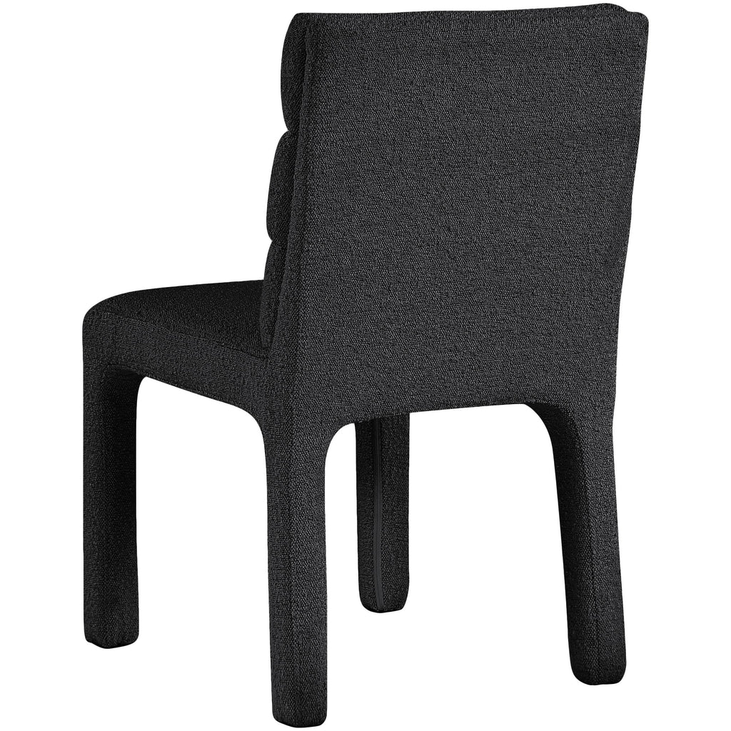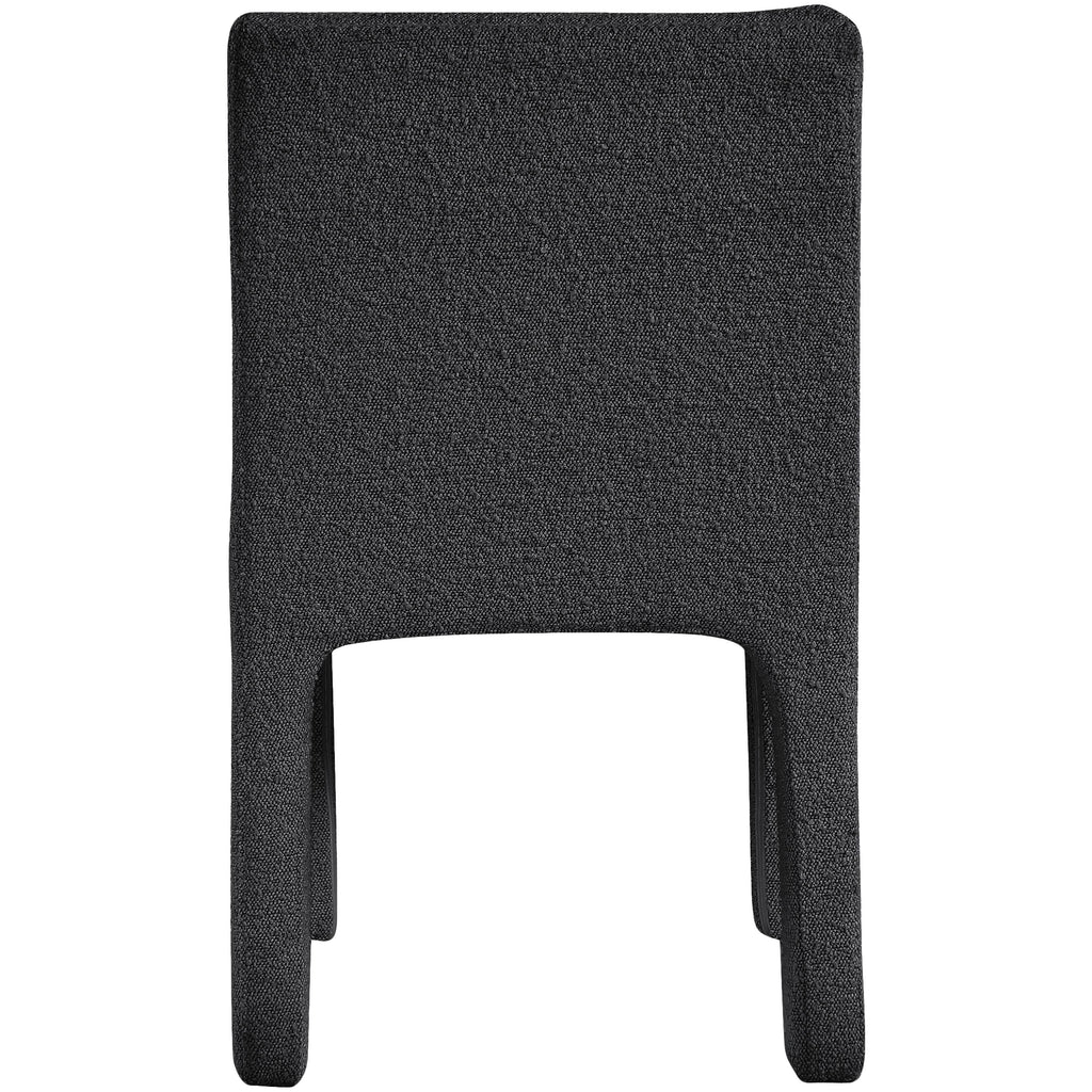 Comfort is key with this Kai boucle fabric dining chair. Stunningly elegant yet boldly understated by design, this dining chair is an ideal addition to your dining room setup. The metal frame ensures lasting durability while the black boucle fabric upholstery gives the chair a sleek and modish look. Tufting on the back adds to the chair's overall comfort level. Pair several of these chairs with your favorite dining table for a complete look.